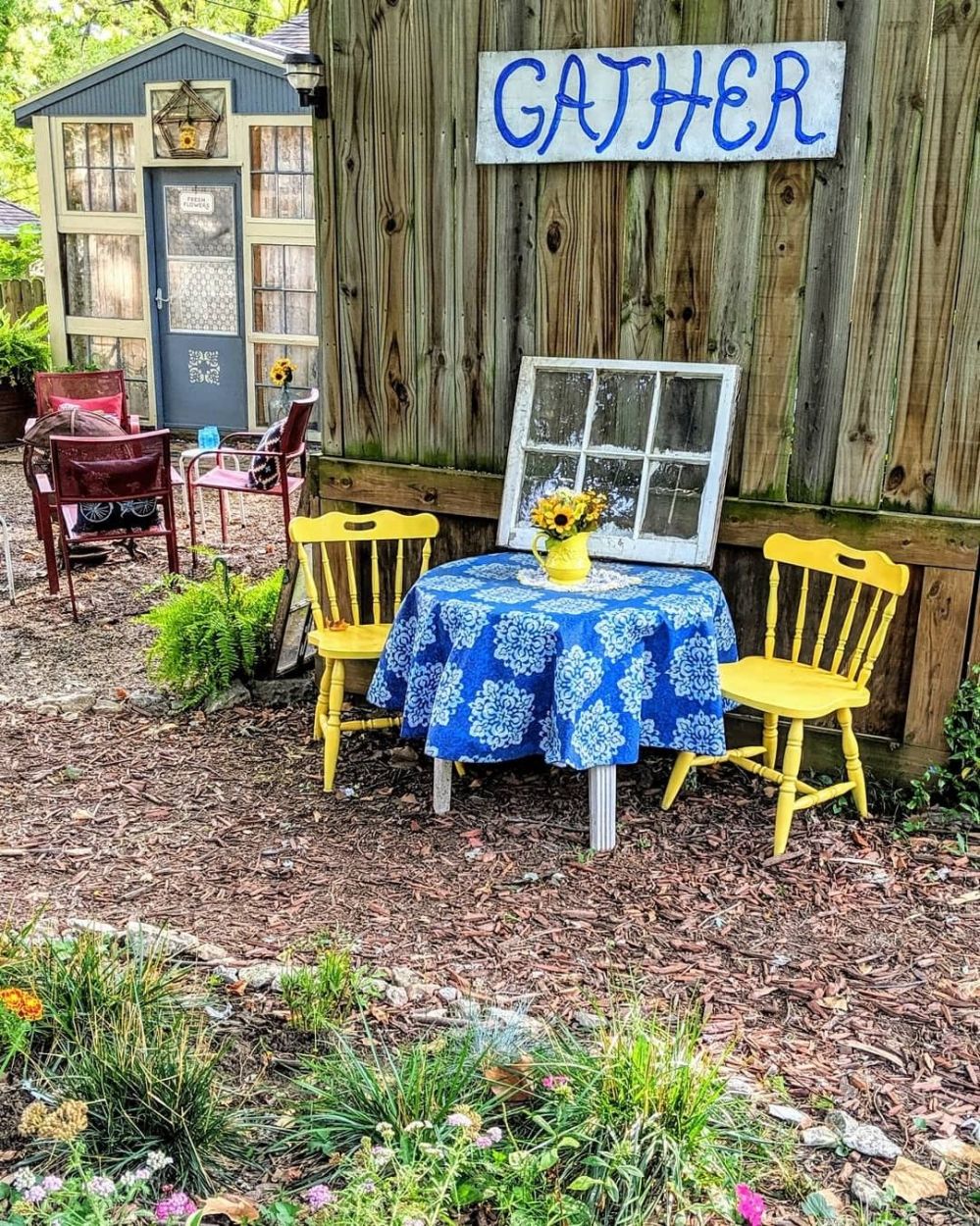By changing the chairs from white to yellow ones, this outdoor room is given a fresh new look. These chairs are from ReStore, found on clearance for just $1. The old wooden window was free, found curbside, or as I fondly call it Curb to Cottage. The GATHER sign, painted on scrap wood, adds a bit of charm.