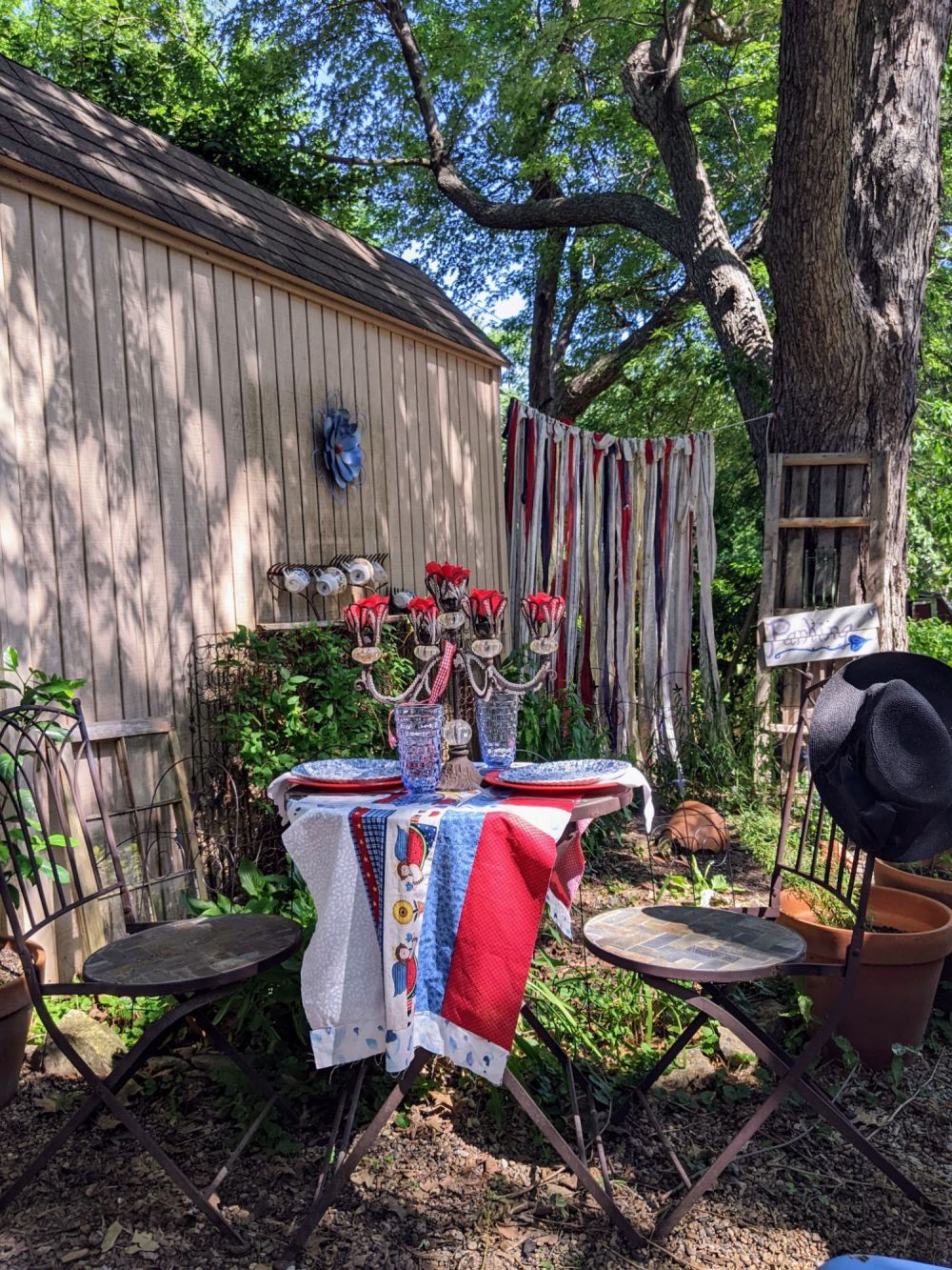 I brought the plastic table to my current home and am still using it after all these years. Wooden chairs can be found at thrift stores for $5 to $10. A little spray paint helps to protect them from the rain. Again, an inexpensive tablecloth works magic on a simple plastic table. Flowers and homemade bunting add a little more color and festivity to the outdoor space, perfect for parties.