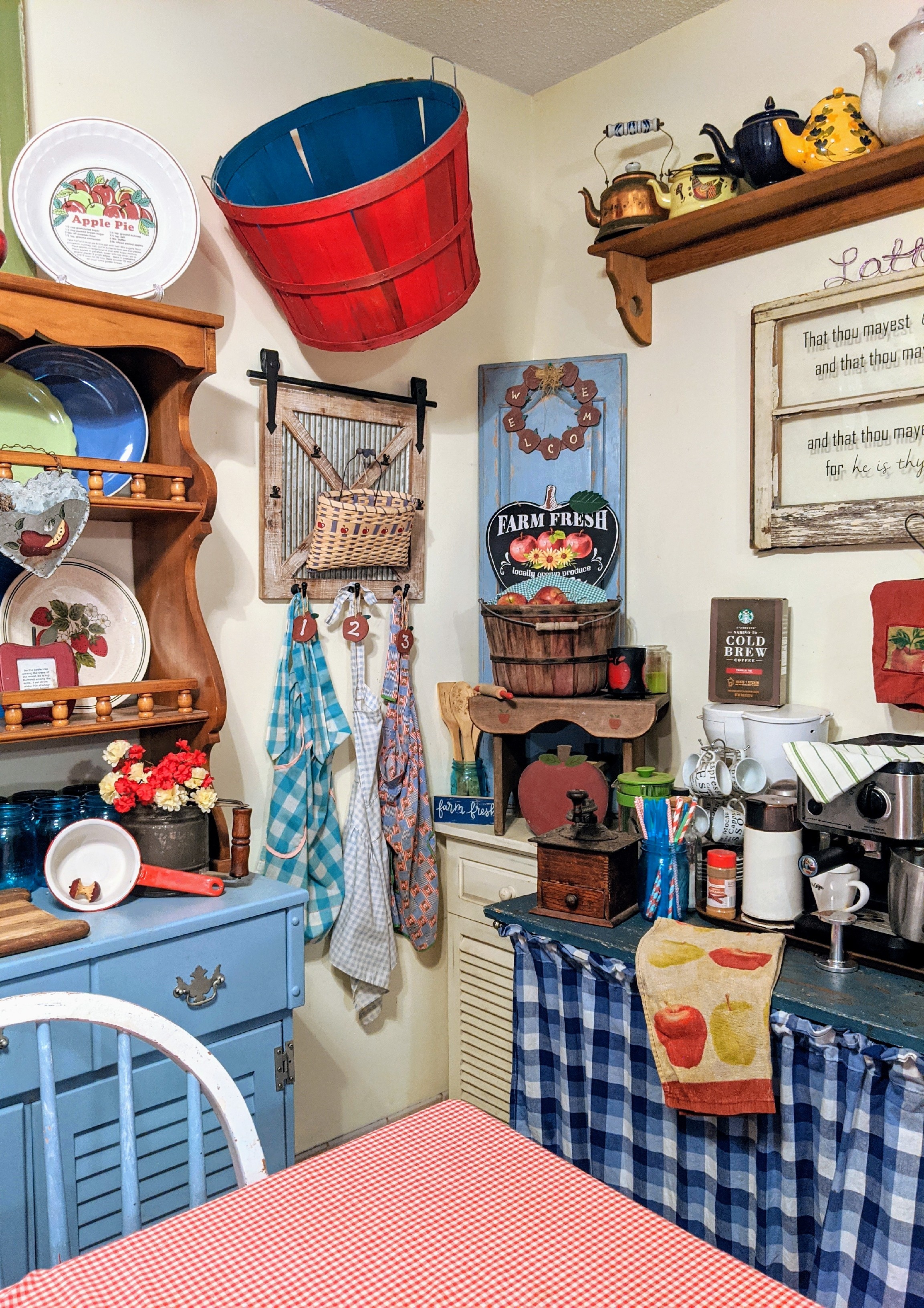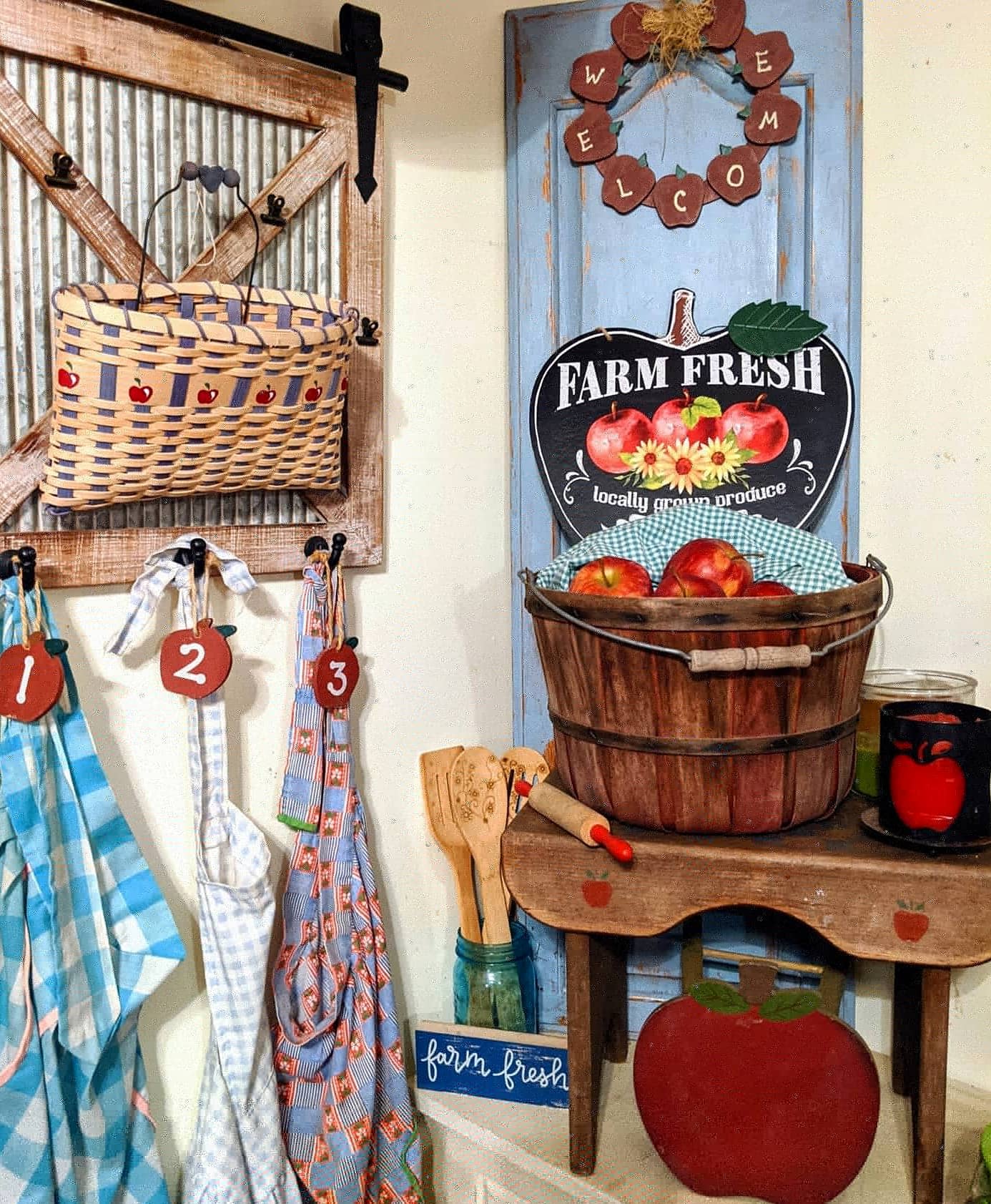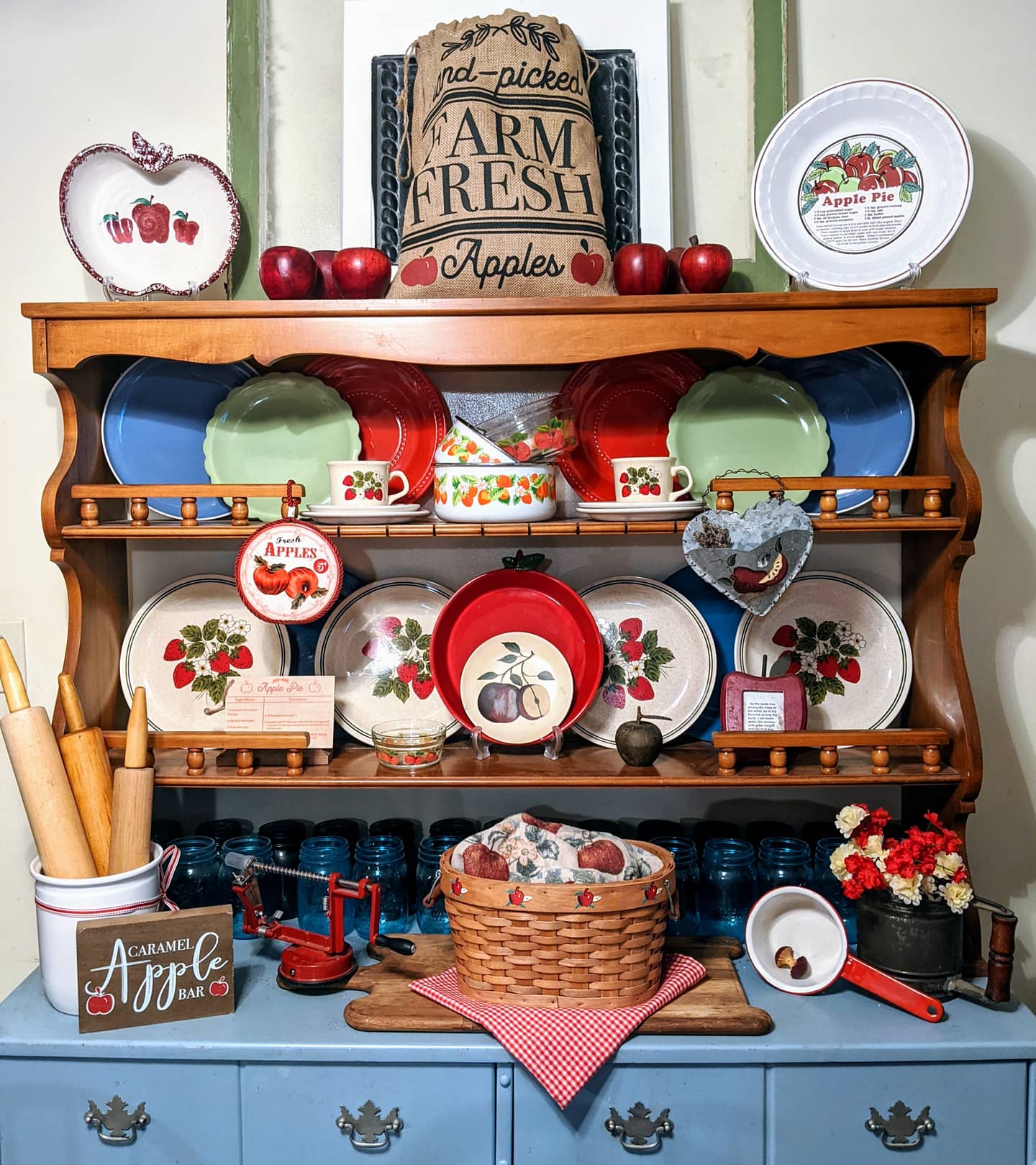 Speaking of apple decorations, I am quite the collector. My students gifted me with the first few, and my orchard just seemed to keep growing over the years! The kitchen is a great place to decorate using an apple theme. A hutch filled with apple dishes and decor is yummy to the eyes.