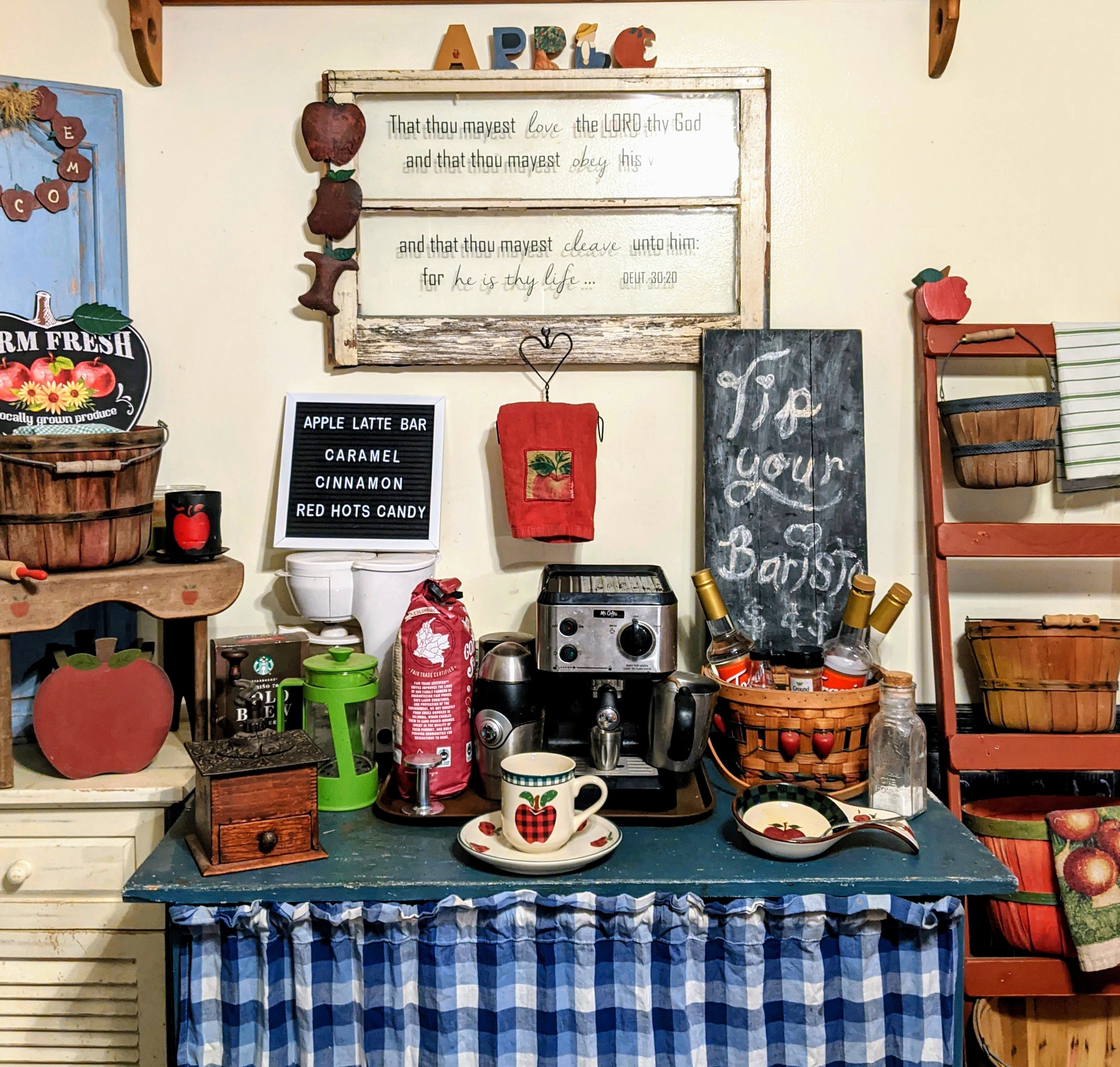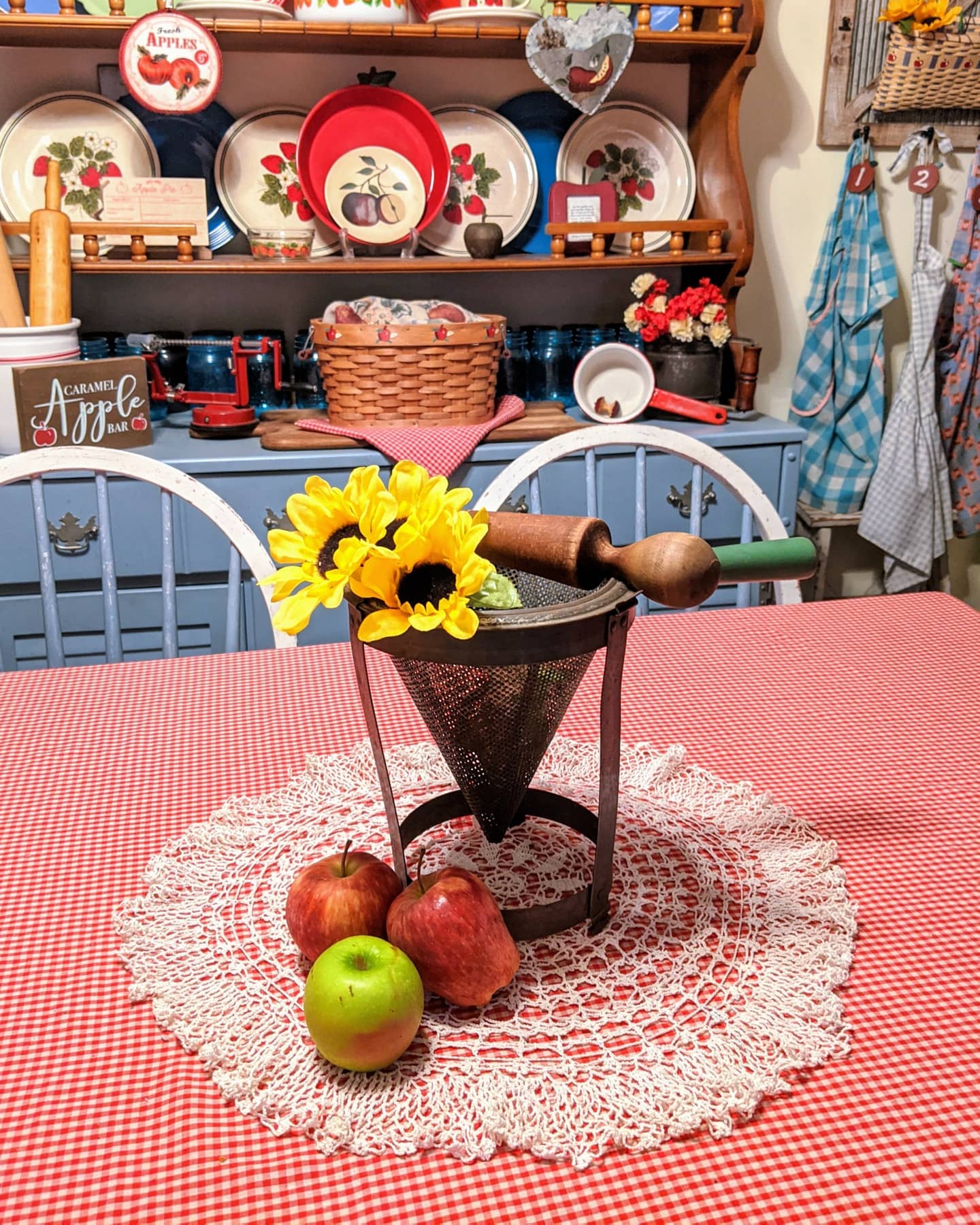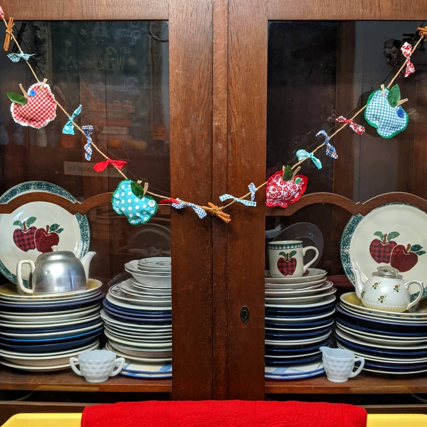 Speaking of apple decorations, I am quite the collector. My students gifted me with the first few, and my orchard just seemed to keep growing over the years! The kitchen is a great place to decorate using an apple theme. A hutch filled with apple dishes and decor is yummy to the eyes.