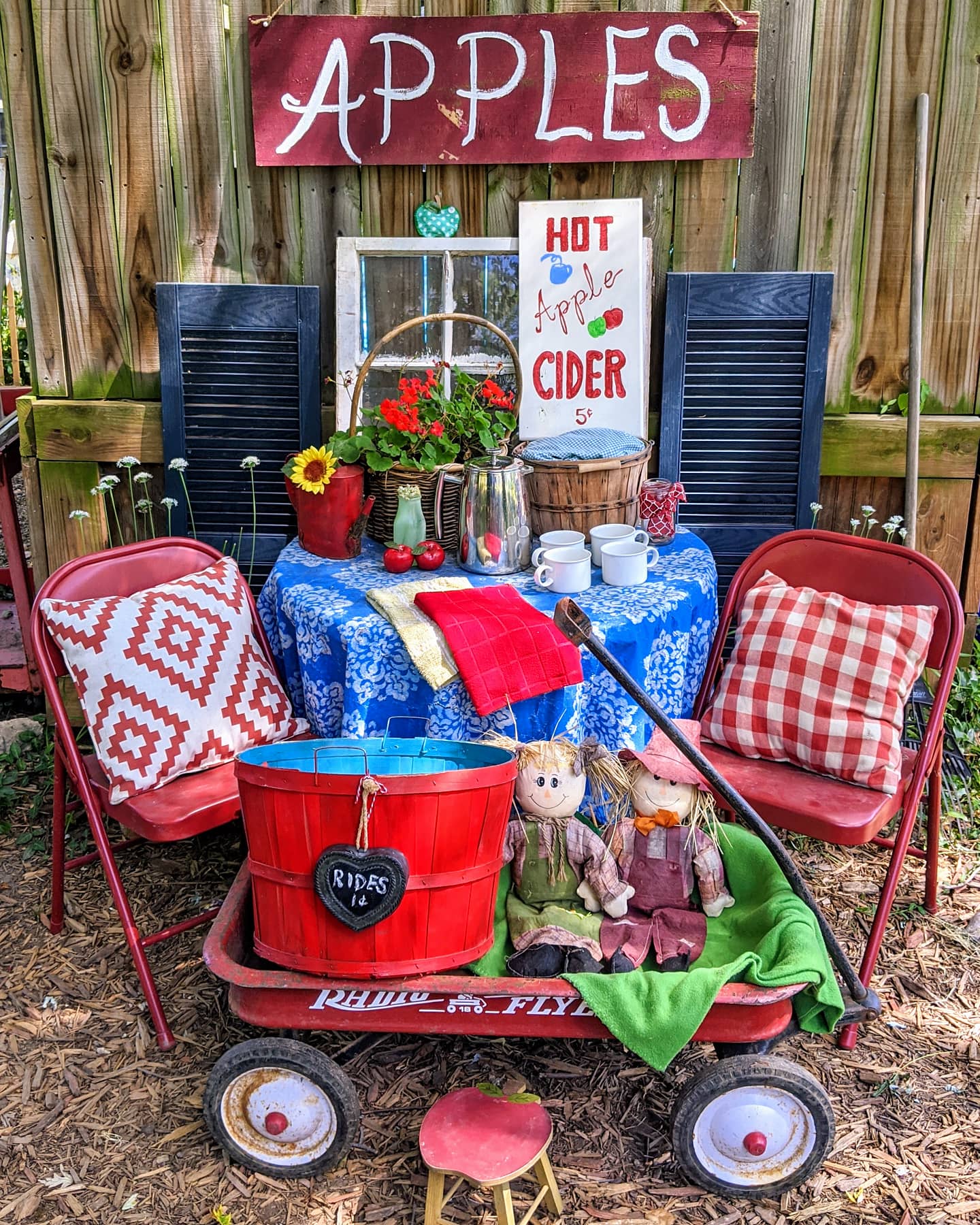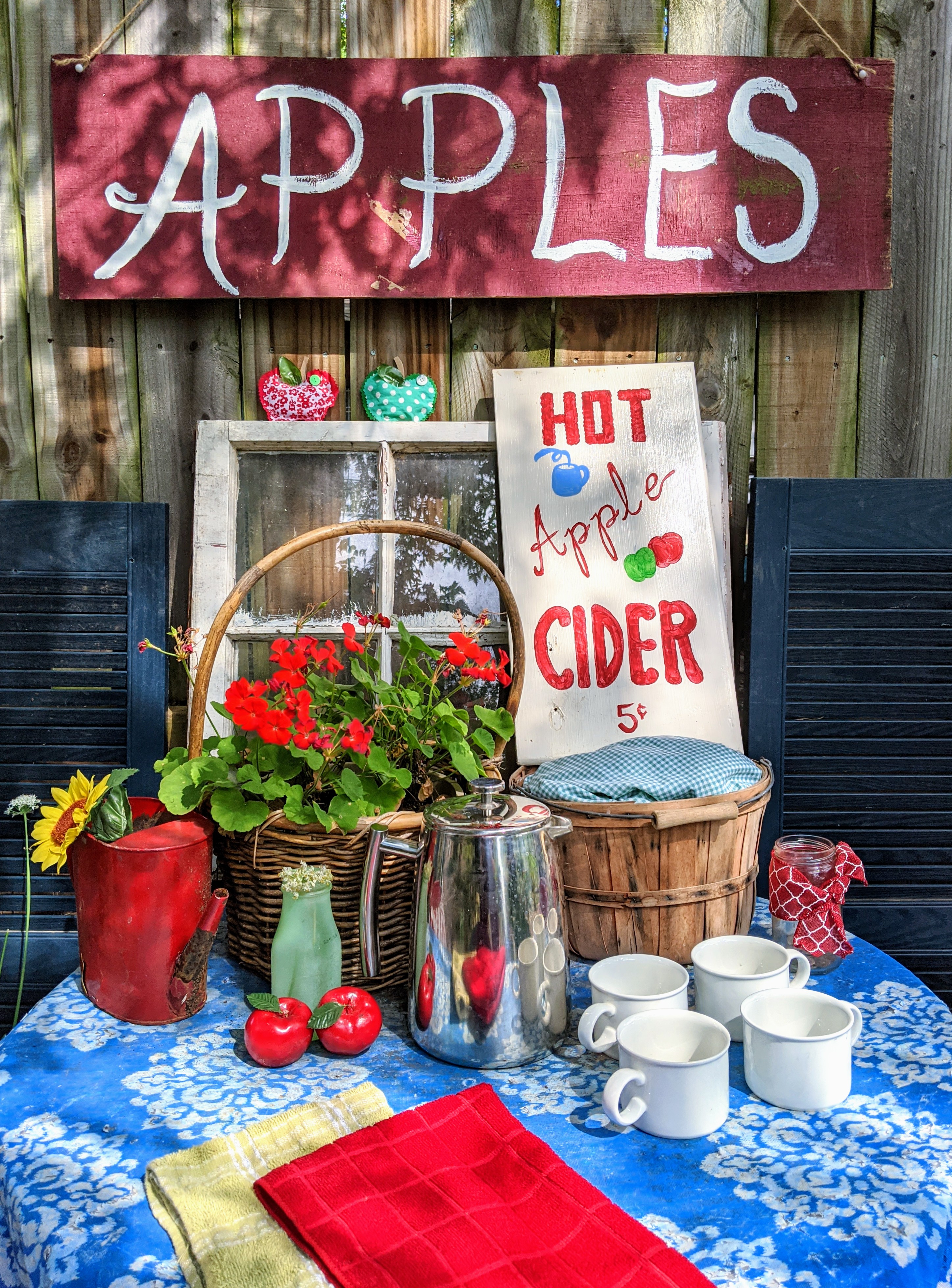 Apple decorations will add to the festivities. You can use apple dishes… found at thrift stores, often for $1 or less. Banners always add excitement to the occasion. This apple banner can be made using a hand drawn pattern, old clothes for fabric, cardboard cut into little stems, and the apples filled with dryer lint stuffing. Hot glue holds it all together.