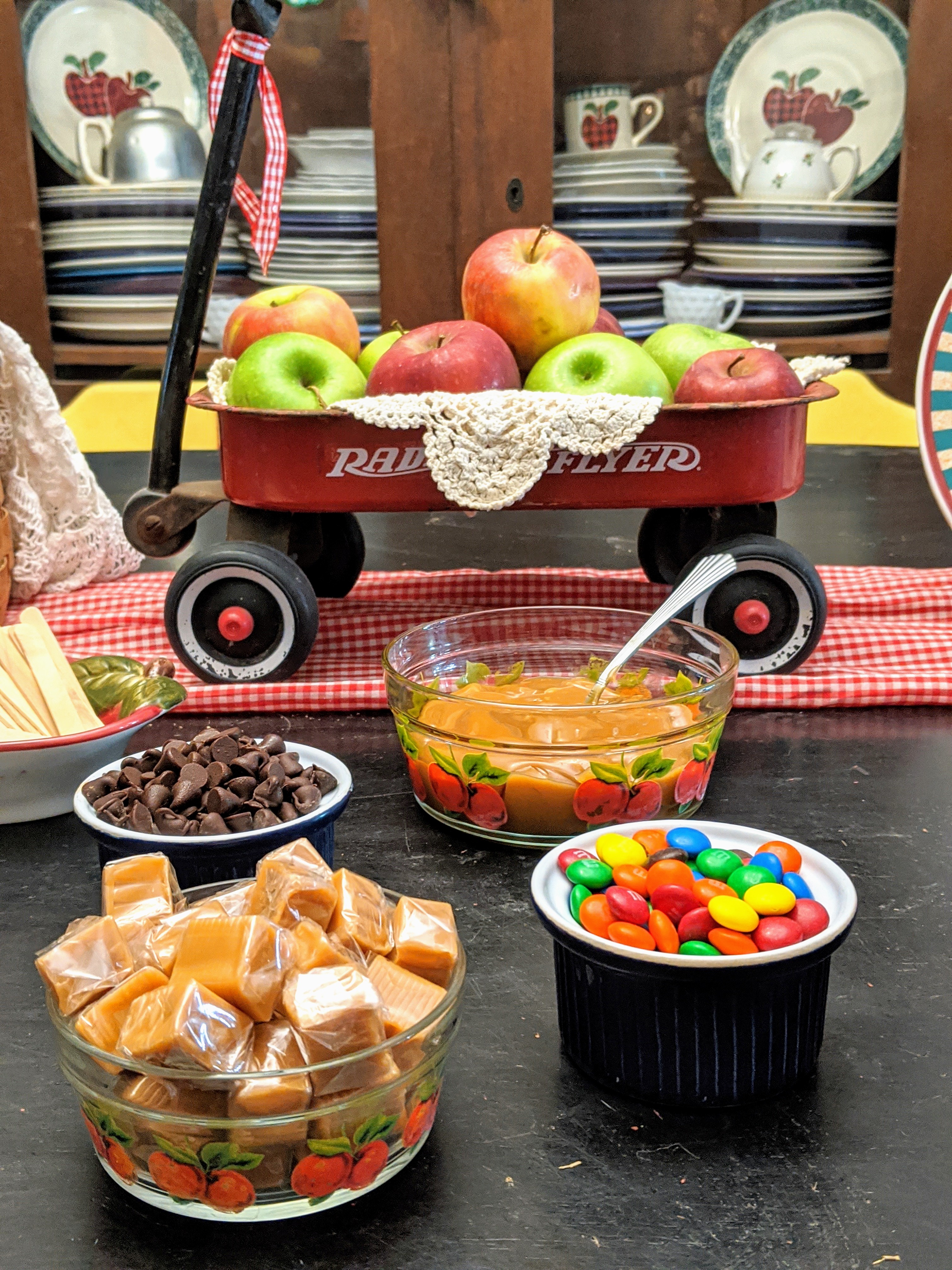 A caramel apple bar is sure to draw a crowd! You can make your own caramel sauce or buy it already made. A variety of toppings isn’t necessary, but they sure are fun! As an alternative, apple slices with toothpicks make a wonderful snack.