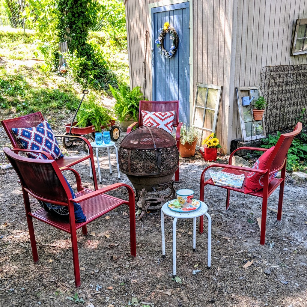 It was time! Our firepit area was needing a little makeover. The paint was flaking on the once shiny red chairs gathered around the fire. I needed to pull them out and stand them in line, along with the rest of my painting projects… just waiting for a fresh coat of paint. Also, I was itching to try something a little different… a new color and rearranging some of the outdoor furniture.