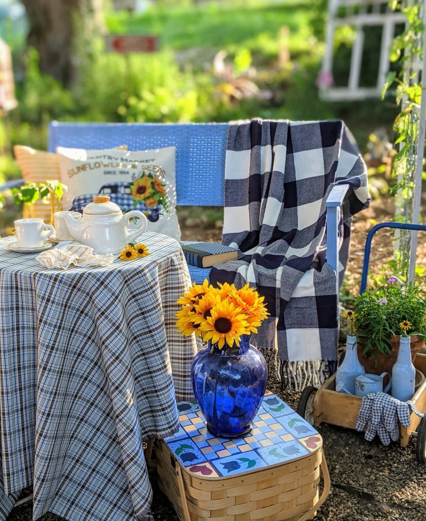 My motto when decorating is: First choose a theme. Then select a color scheme. I had envisioned a late summer sunflower theme with blues and yellow. I added all kinds of accessories fitting those colors and theme, including pillows, vases with flowers, tablecloth, and throws. I mixed in a few vintage touches as well for a bit of character and charm.