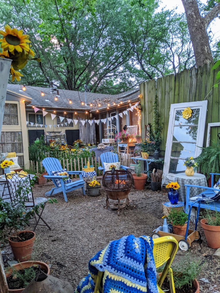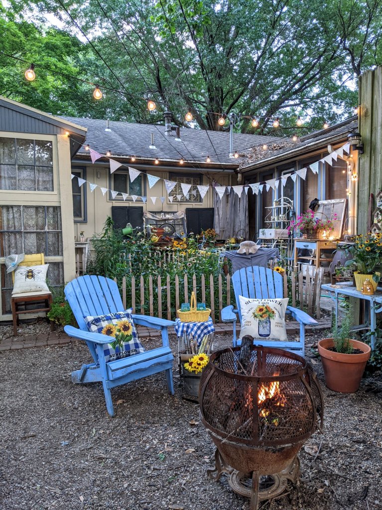 You’ll notice I also included a little table, perfect for coffee or tea cups, as well as snacks. I placed it a little off to the side, away from the fire pit. I intended for this whole area to be be a morning haven, afternoon respite under the shade of trees, as well as an evening gathering spot for family and friends. In the Spring, we hung string lights to create a wonderful oasis under the stars. With the firepit, this area can be used through several seasons. We have plenty of throws ready for chilly nights of snuggling!