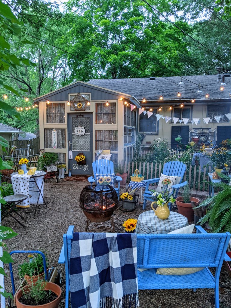 Since completing the project, I’ve found myself gravitating to this area more and more. It’s just so comfortable! I’m working on redecorating the inside of the greenhouse now, so it will match. I can’t wait to share it as well! I hope you’ve found inspiration and ideas from my cozy backyard makeover. It’s proof that you don’t even need a deck or patio to create a happy outdoor haven!