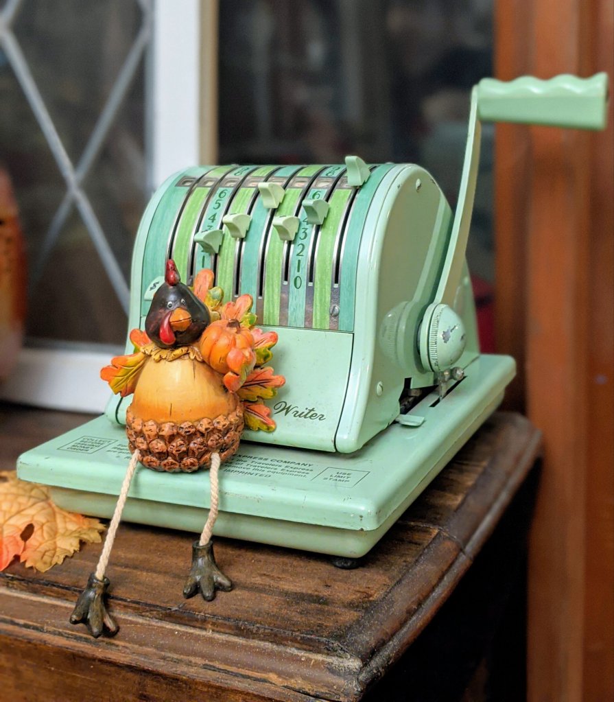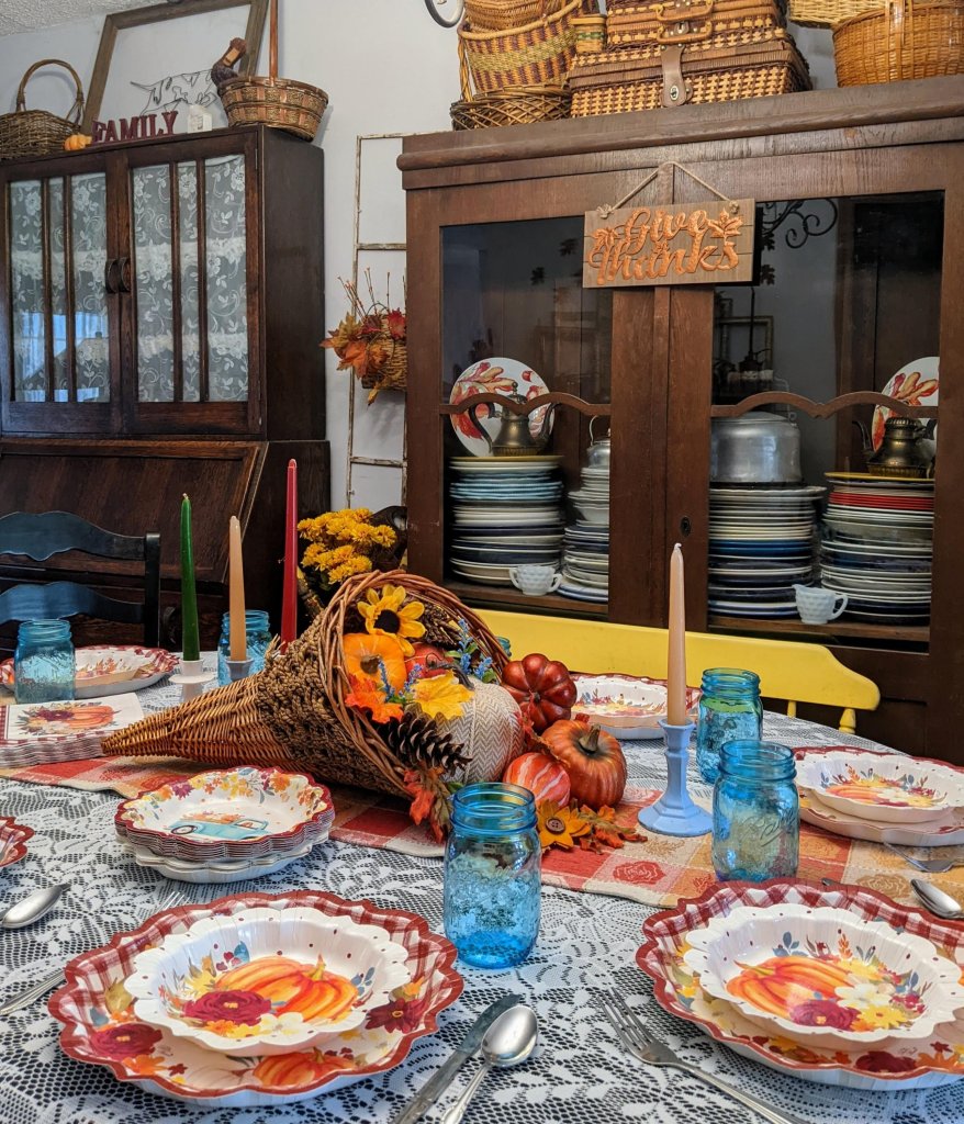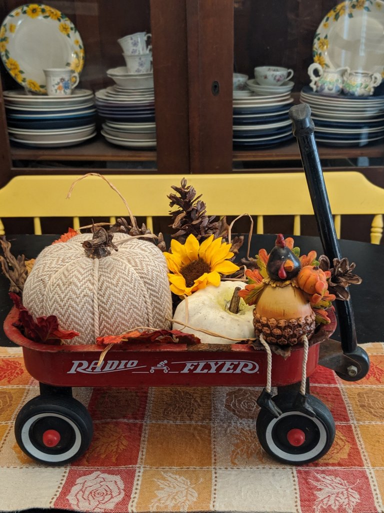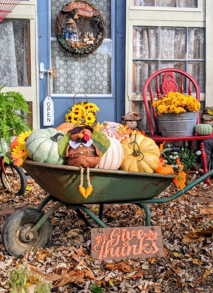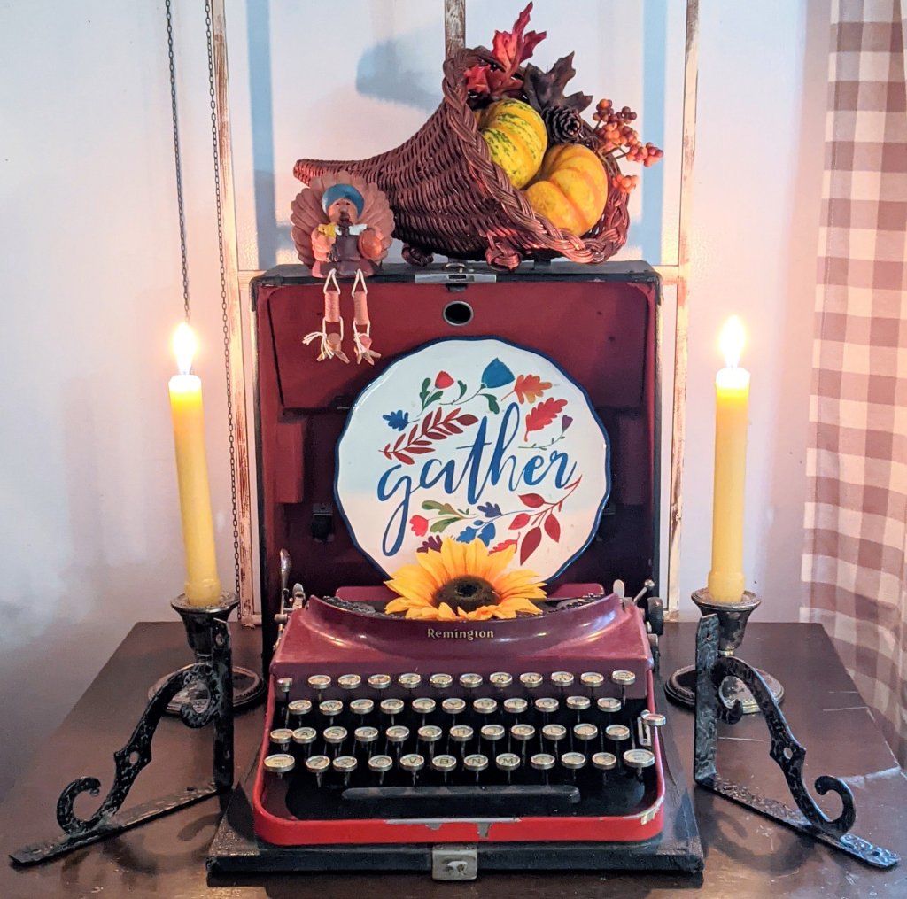 This particular Thanksgiving landed on my birthday. We used Pioneer Woman paper plates… because this birthday girl wasn’t about to spend her special day washing dishes.This vintage vignette creates a cozy Autumn feel. I like to decorate my Remington typewriter for various holidays throughout the year.I enjoy transforming wagons and other unexpected items into whimsical cornucopias. So cute!A vintage wheelbarrow overflowing with pumpkins, leaves, and flowers makes an adorable outdoor cornucopia.