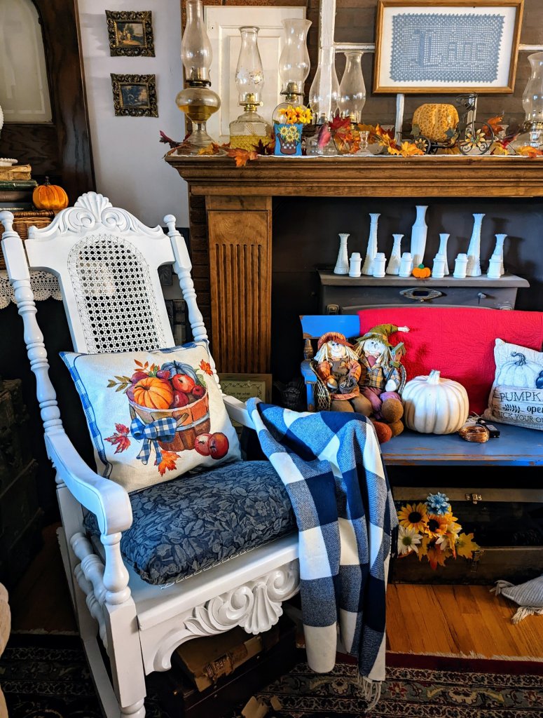 For me, cozy definitely includes color. After all, Fall is such a colorful time of year as the trees put on their warm Autumn sweaters. I like to bring out all kinds of colorful quilts and throws, perfect for Autumn evenings of snuggling, but they’re multifunctional, serving as beautiful decor.