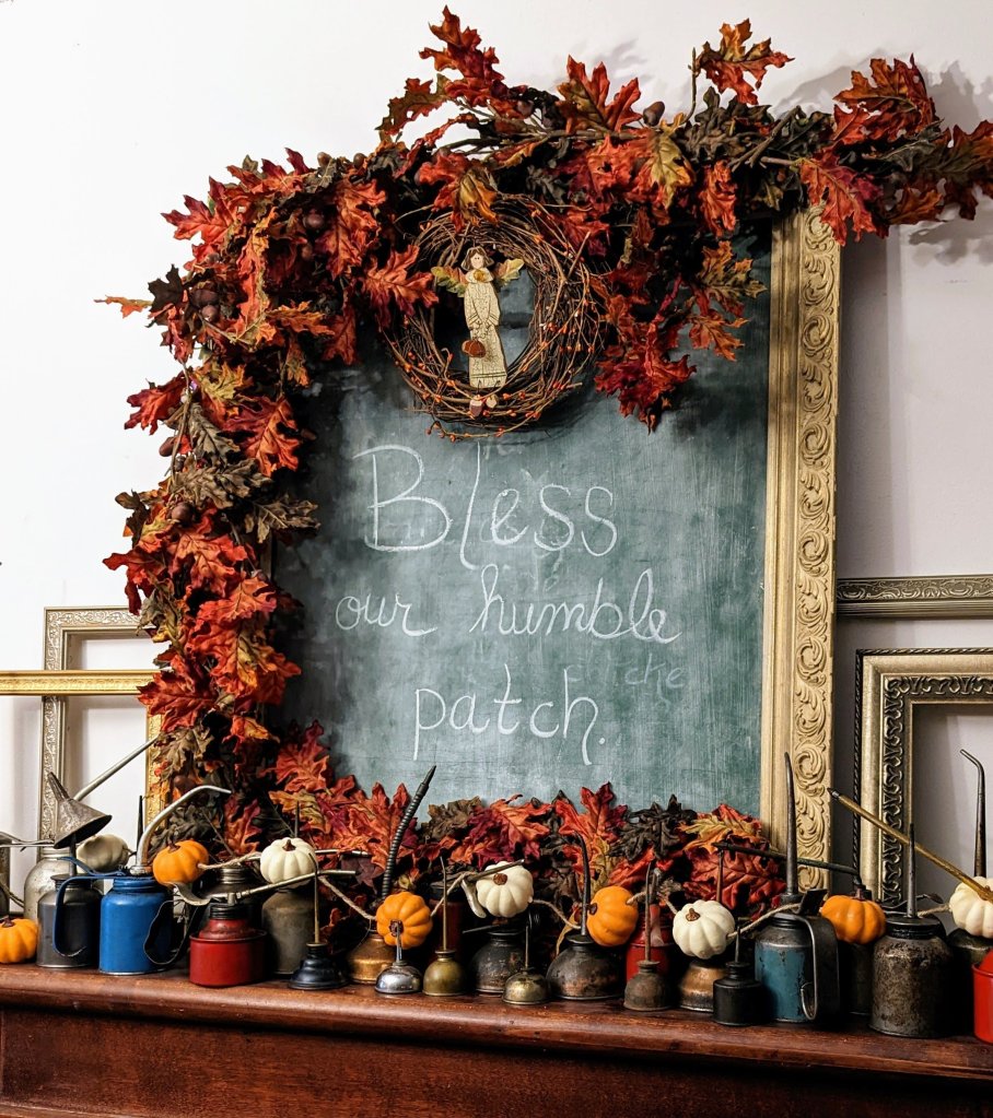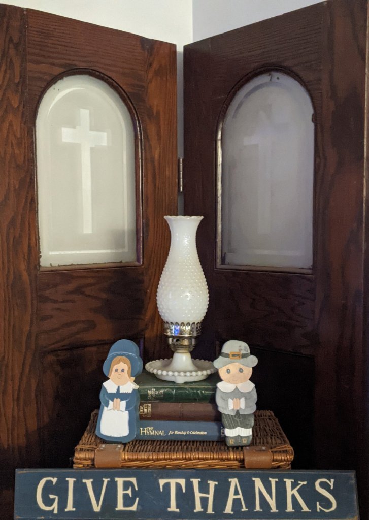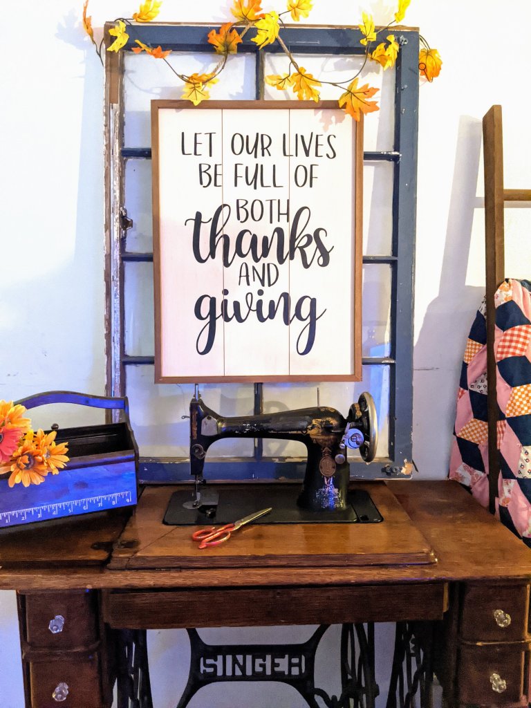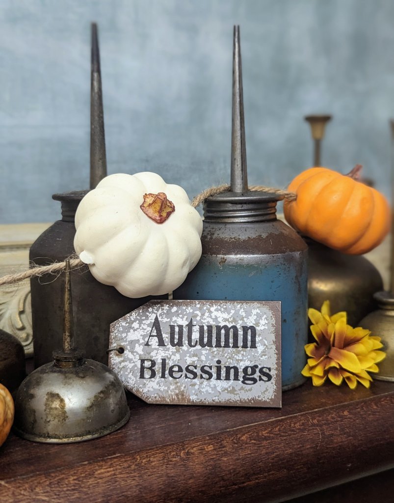 My husband thinks this is a fancy display of his oil cans. Nonsense! This is a creative pumpkin patch!It’s not called Thanksgiving without a reason. Did you know that the more you give thanks, the more content you will be?I found this reversible sign at Aldi for a great price. Anytime I can get double duty from a piece of decor, I am doubly delighted.You might not have room for a bigger sign, but this sweet little message is just the right size.