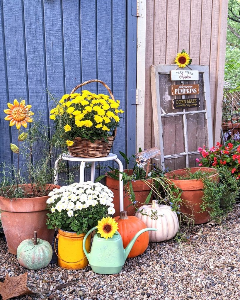 Pumpkins aren’t just for Halloween… or pumpkin pie. They can still be used in November for Thanksgiving decorating. I like to buy a couple more faux pumpkins each year… after Halloween when they’re marked down. Squirrels are brutal with pumpkins, so I use faux outside. Faux sure!