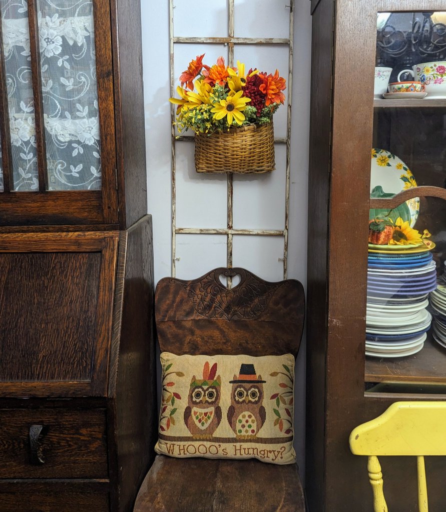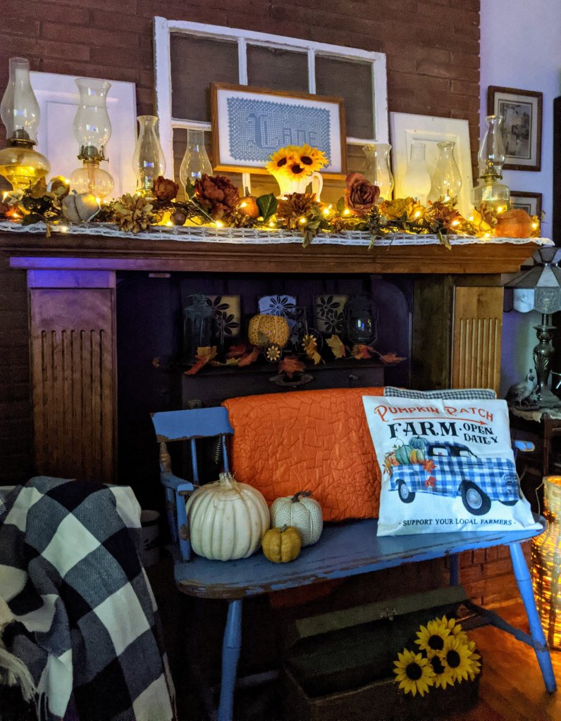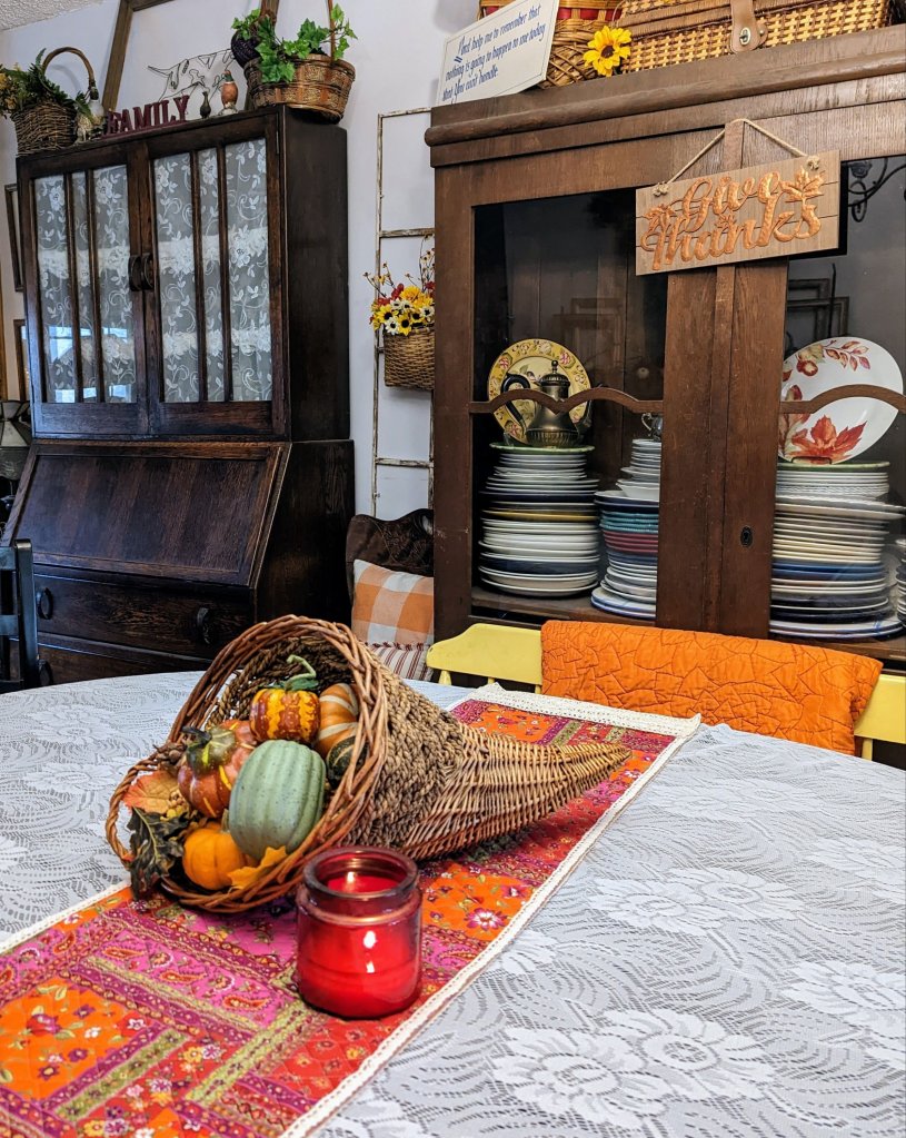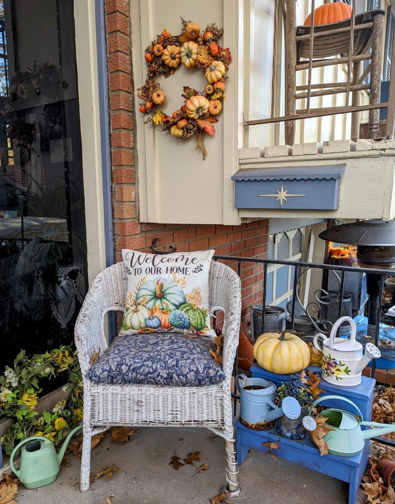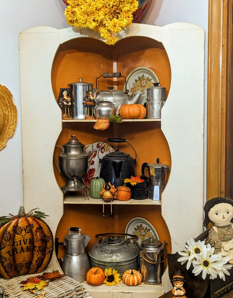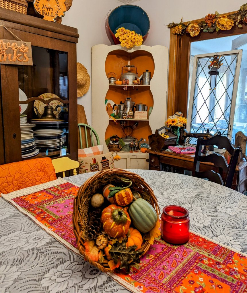 Just a few small pumpkins on this cozy corner cabinet. Don’t miss the metal pumpkin beside the vintage cabinet. After my first husband passed away, I bravely hosted my first ever Thanksgiving. I splurged just a little on the metal pumpkin to add a bit of warmth to our home. Now it’s a reminder to give thanks for how faithful God was during difficult times.