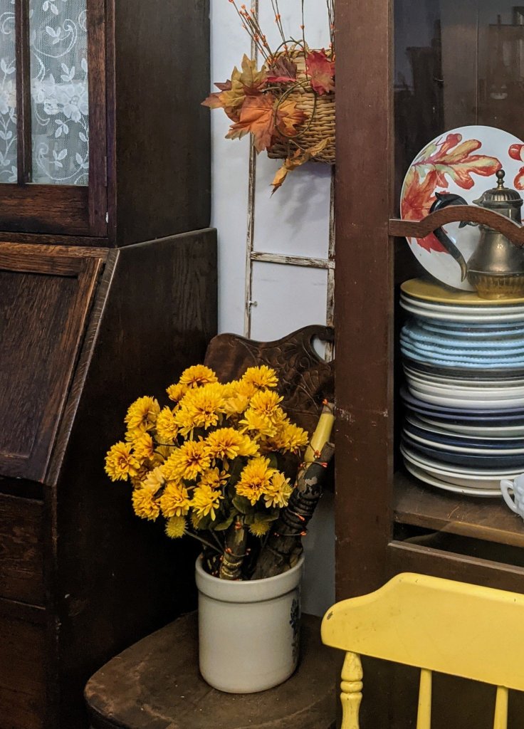 These are faux flowers in the crock. I was surprised at how realistic they look when I found them at Goodwill. These are real flowers with a couple of faux sunflowers added to the mix. I will often display both faux and real together.