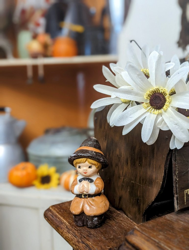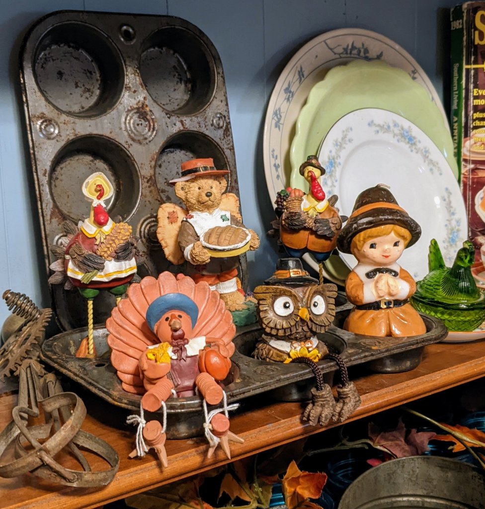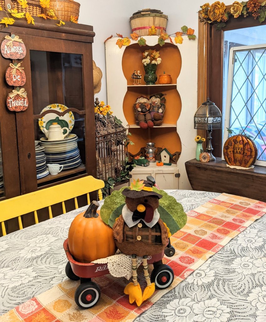 Gather the gang! Turkeys, Pilgrims, Native Americans, and more. Whether placed in groupings or individually, smaller knick knacks are a fun way to add a touch of Thanksgiving decor. While growing up, my kids loved gifting me with knick knacks bought with their hard earned paper route money. Being sentimental, I still display their gifts.