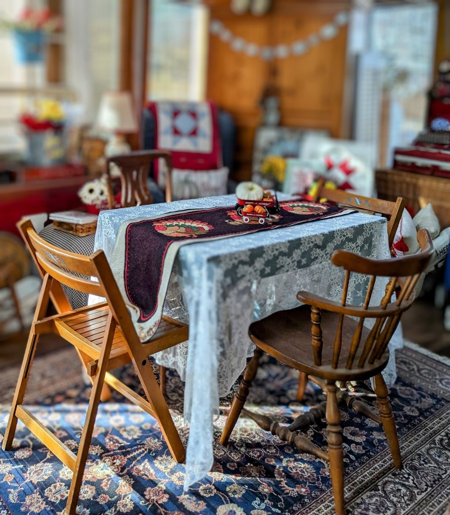 This was my first ever Thanksgiving table runner. I’m still smitten with its floral design and colors. This turkey table runner was a hand-me-down. Even the kids’ table gets a runner.The pairing of orange and pink made this a striking table runner. I found this beauty in a hand-me-down bag of quilting scraps. All it needed was the crocheted ribbon to give it a finished look.