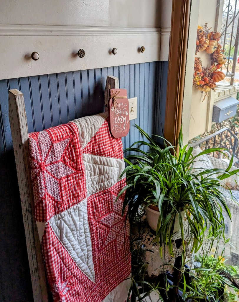 Keep it cozy! We greet our guests at the door with a smile and warm country cottage welcome. This homemade quilt, found at an estate sale, hangs in our entry foyer. I change the quilt throughout the year. Hanging a quilt over a bench is an easy way to add Fall color. I rescued this orange quilt from my husband’s garage. He was using it as a moving pad. It looks wonderful with the table runner.Notice how the red quilt and blue gingham throw add both color and coziness. The pillow cover ties the two colors together.