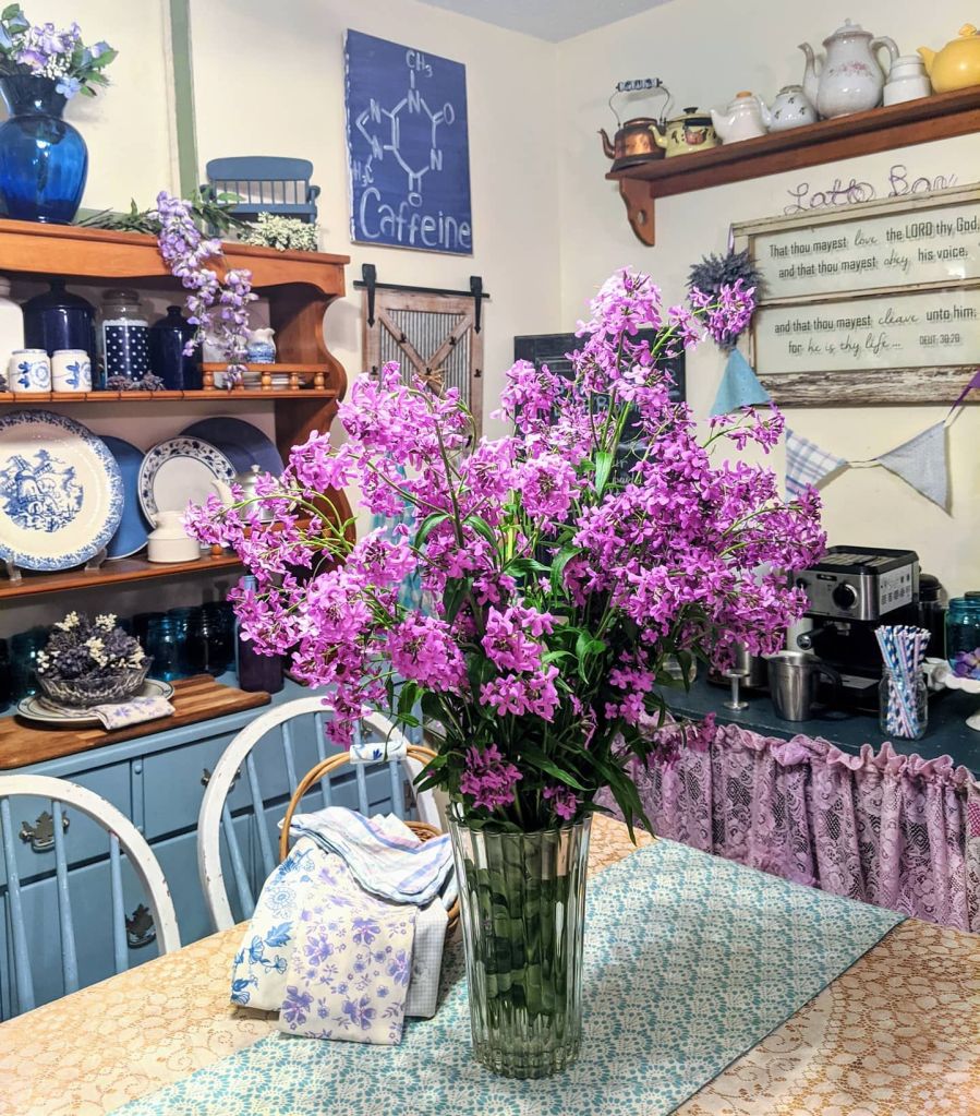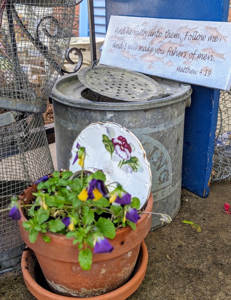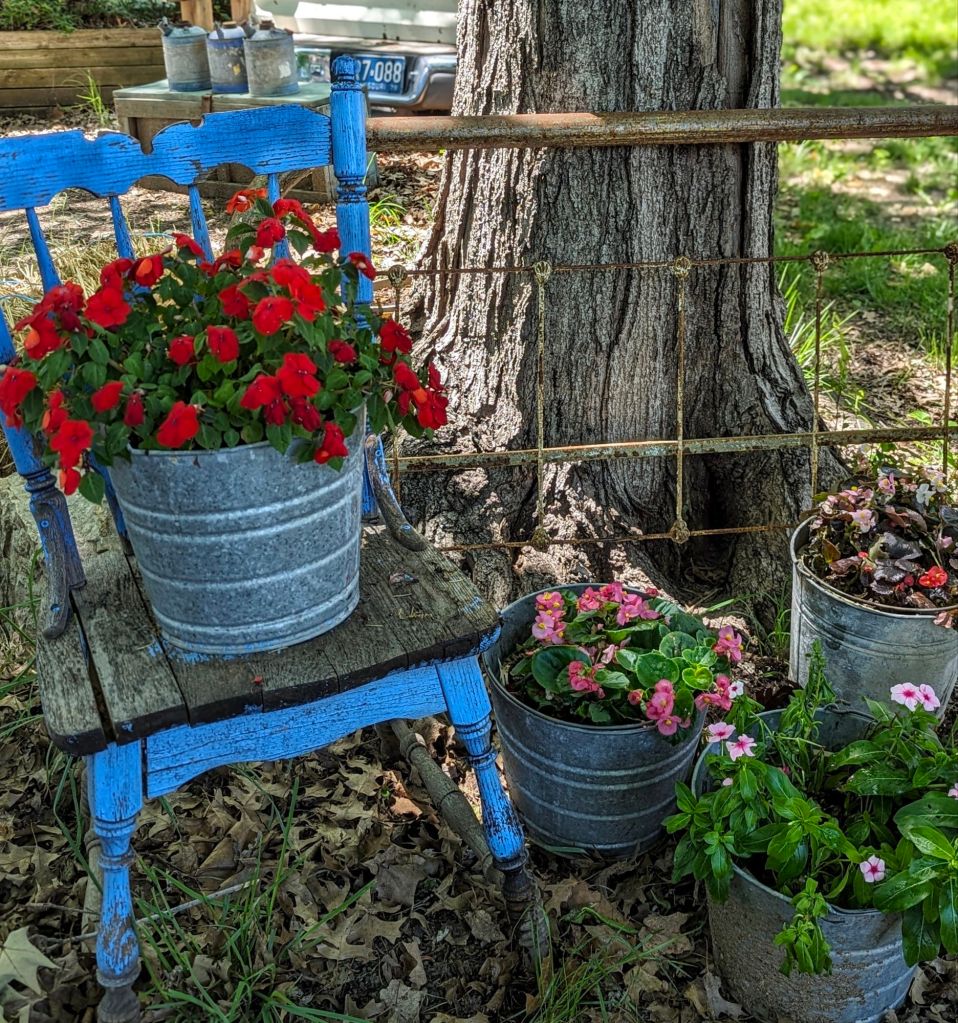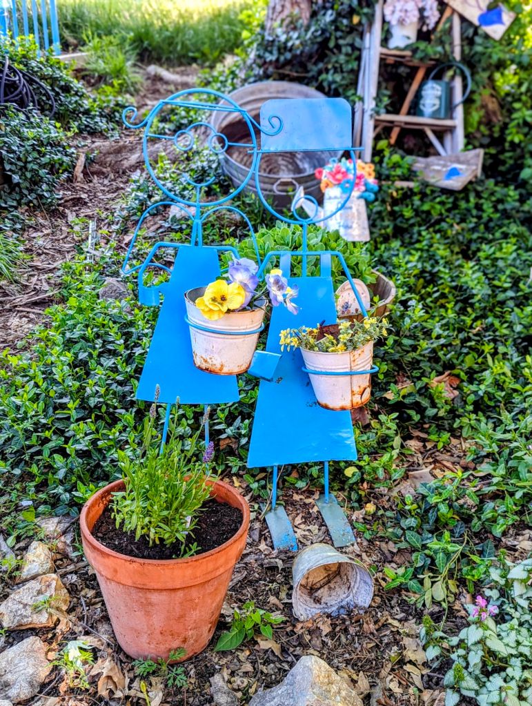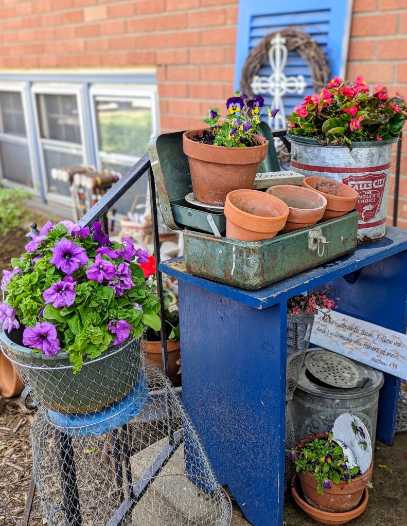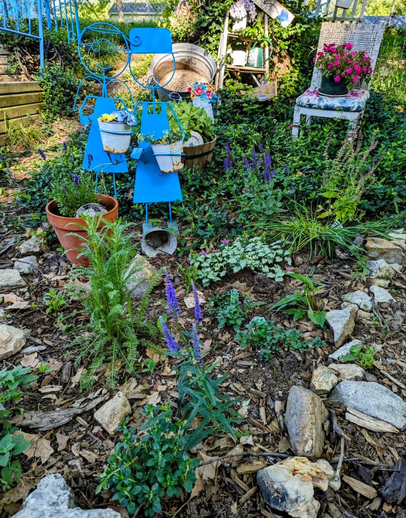Nothing draws you in like a bright blue arbor and winding brick path! Perfect for Easter and April visitors!Lots of pretty colors from the Phlox, Violas, Azaleas! I found a couple perennial Forget-me-not plants to put in gifted clay pots along the pathway.Notice the difference between April and May? The arbor is quickly filling in with Wisteria. I’m hopeful that this year we’ll finally have wisteria blooms.A few vintage pieces to add whimsy, color and charm to our cottage! The wheelbarrow needs flowers still; I prefer potted plants to prolong the life of the wheelbarrow. The lamp stand used to adorn a backyard garden, but it’s perfect for this echinacea patch. Soon, I’ll add a little flag for a patriotic touch.I have 5 wagons in the front yard, our welcome wagons. This flag was irresistible with the WELCOME message. Potted snapdragons add color in this space till the perennials bloom. I’m proud as a peacock over this beauty found in a heap of treasures headed to the dump. She lights up too!Doesn’t this beckon you to come sit for a bit?! I hope so! Every garden needs places to sit. I call this garden on the side of our house Wild Side garden. It was started with a few mixed packages of wildflower seeds 5 years ago. It is just beginning to bloom for this season. It blooms from late Spring through Fall. Sweet Williams, Coreopsis, Daisies, and Purple Coneflowers are some of the wild residents here.These Sweet Williams remind me of snowballs! The rusty headboard is a prized ReStore score.Sweet Williams don many beautiful Spring colors. I am always surprised that people are unfamiliar with them, considering how easy they are to grow. They self-sow as well. I still need to clean out the leaves from this garden to ensure seeds will find a new home, landing on soil.Sweet Williams look especially beautiful in bouquets. I save empty food jars… salsa, spaghetti sauce, lattes, etc. to use for backyard bouquets. I usually wrap the jar with ribbon or lace tied in a bow. They end up displayed on my kitchen window ledge for viewing while doing dishes… or given to friends and neighbors.Coreopsis is another favorite of mine. It too self-sows. Mine like to hang over the bed and sow future plants in the grass. I dig them up and transplant them. They are biennials, blooming in their second year.A potted petunia plant fits just right in this vintage Cyclone spreader. I never pay more than a few dollars at estate sales for goodies like this red cutie. Most people would never consider repurposing it into a planter. Isn’t it adorable?!Our welcome wagon is getting ready for a bit of red, white and blue. Memorial Day weekend will be here soon. This Geranium looks happy…so far. In past years, Geraniums didn’t like me. They had a change of heart after I bought a sad clearance Geranium for 25¢ and nursed it back to health.I enjoy collecting vintage fishing items. Occasionally, I find a bargain at an estate sale. I call this our Fishers of Men front porch display.This is a May view of our Fishers of Men container garden. It is such a fun little porch display! My friend and mentor, Lisa, made the Bible verse sign for me. It’s perfect! I keep it under the blue bench to protect it from rain. I like to add vintage items to my potted plants for unexpected garden whimsy. I prefer Violas to Pansies because they endure heat better, lasting longer into the summer.Every Spring I scoop up a bunch of hanging flower baskets on sale for around $5. They add a bit of color till the gardens are in full bloom. This purple Petunia fit right inside an old $1 fishing basket.Adding a thrifted teacup and saucer to these potted Violas is a charming cottage touch guaranteed to make others smile.This is my Shady Things Happen Here garden. We have struggled to grow grass in this area, so I am trying to convince my husband on the idea of covering it in mulch with a rock border. I think a dry creek would look beautiful to the right of the tree. Gardens often start with a vision and then somehow take on a mind of their own. I try to be attentive and listen. It’s less work in the end!This is my Pickin’ Patch. It is filled with vintage gardening tools that we picked on thrifting adventures… rakes, wheelbarrow, spreader, push mower, and even a plow, which you can’t see in this picture. There are a couple more rakes to the left, out of the picture, including my favorite red rake. I planted a mixed packet of seeds in this spot last year and am excited to see what blooms this year. A once clearance shelf Clematis now takes hold of an old mattress coil. Notice how it grabs onto the metal H as well. I call this garden area Tea for Two.This pale lavender bloom is a complete surprise, waiting a couple years before finally blooming. This is my idea of a flea market garden!A bistro table beside this garden is the perfect place to sip tea and capture the view!Splish Splash! This old claw foot tub found at ReStore is such a fun repurposed garden! Last Fall I planted bulbs and covered them with BBQ grills to keep the squirrels away. Tulip blooms in April and Alliums in May!We have a visitor! The rusty rake heads found on a FREE table at a garage sale keep the pesky squirrels from digging and destroying.At my previous home, purple Dame Rockets adorned my Spring garden. They are still one of my favorites. Two years ago I sowed quite a few seeds and was disappointed when nothing happened. This beauty surprised me this year. What a blessing!Purple Dame Rockets make such a pretty wildflower bouquet!I purchased the old rocker on clearance day at an estate sale. This is my new morning spot, amidst flowers, bees, butterflies and singing birds.Isn’t this old kerosene stove perfect for potted herbs?!!! We found it at a yard sale deep in the city. I’m smitten!The metal plant markers are gifts from loved ones. I like a little something extra paired with my plants.Basil is a wonderful herb to grow and tastes delicious in homemade pesto, a 