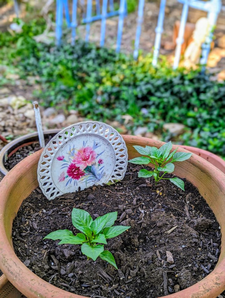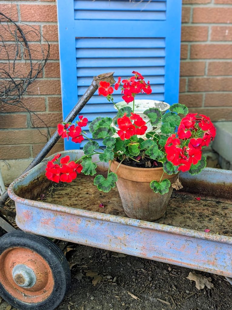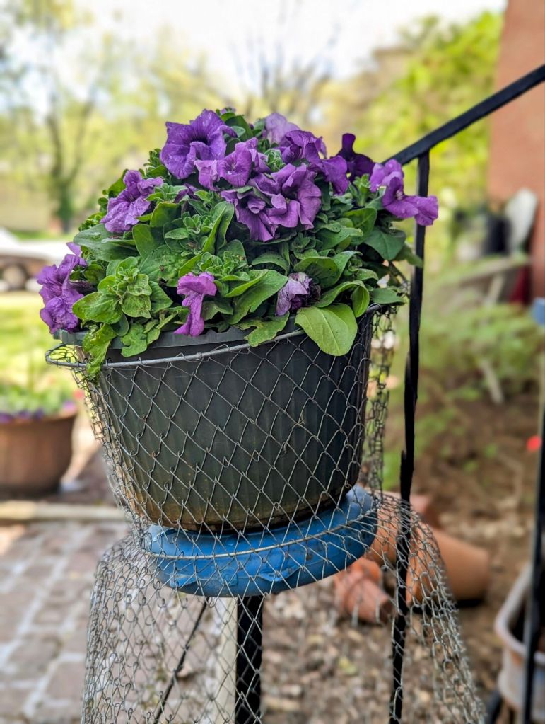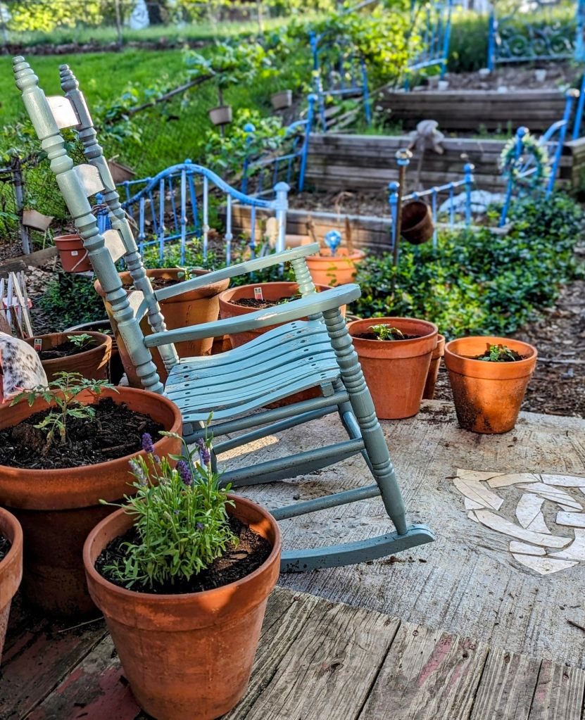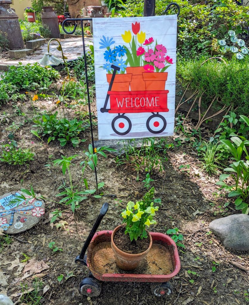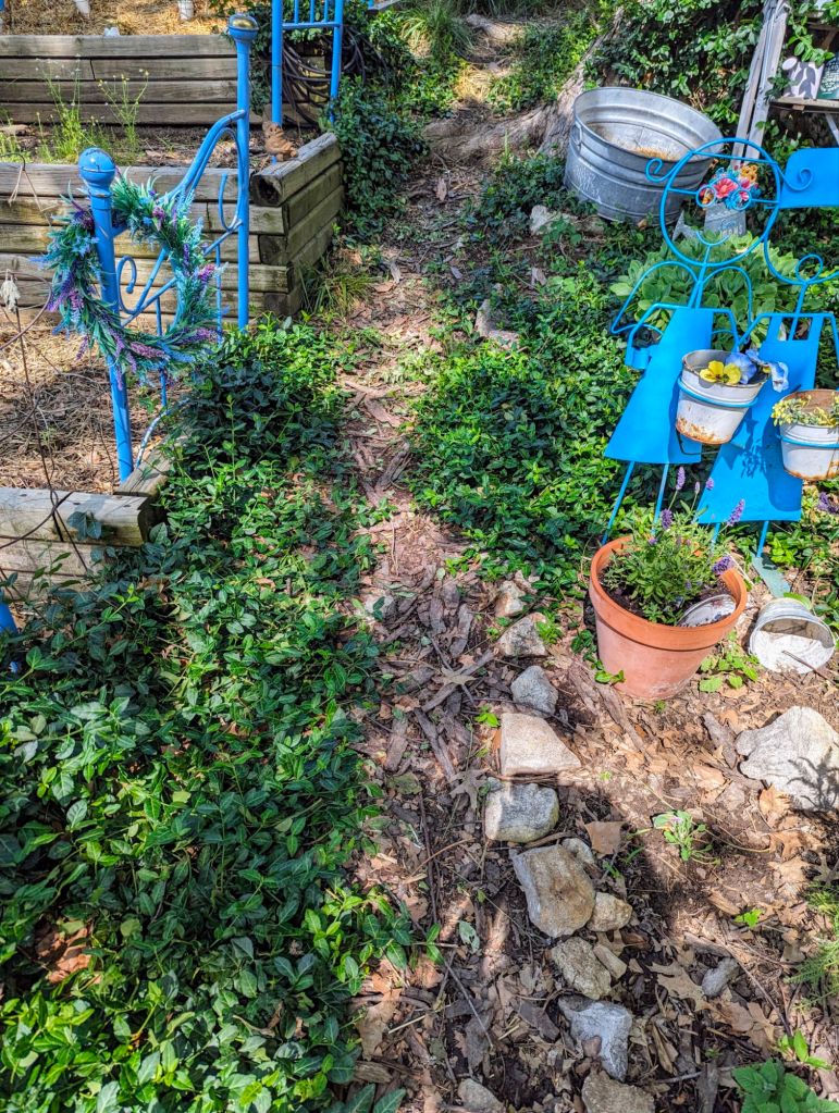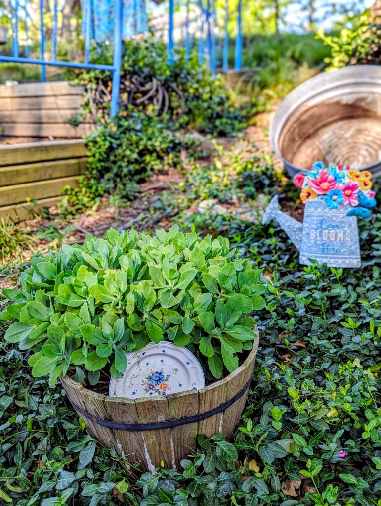 Nothing draws you in like a bright blue arbor and winding brick path! Perfect for Easter and April visitors!Lots of pretty colors from the Phlox, Violas, Azaleas! I found a couple perennial Forget-me-not plants to put in gifted clay pots along the pathway.Notice the difference between April and May? The arbor is quickly filling in with Wisteria. I’m hopeful that this year we’ll finally have wisteria blooms.A few vintage pieces to add whimsy, color and charm to our cottage! The wheelbarrow needs flowers still; I prefer potted plants to prolong the life of the wheelbarrow. The lamp stand used to adorn a backyard garden, but it’s perfect for this echinacea patch. Soon, I’ll add a little flag for a patriotic touch.I have 5 wagons in the front yard, our welcome wagons. This flag was irresistible with the WELCOME message. Potted snapdragons add color in this space till the perennials bloom. I’m proud as a peacock over this beauty found in a heap of treasures headed to the dump. She lights up too!Doesn’t this beckon you to come sit for a bit?! I hope so! Every garden needs places to sit. I call this garden on the side of our house Wild Side garden. It was started with a few mixed packages of wildflower seeds 5 years ago. It is just beginning to bloom for this season. It blooms from late Spring through Fall. Sweet Williams, Coreopsis, Daisies, and Purple Coneflowers are some of the wild residents here.These Sweet Williams remind me of snowballs! The rusty headboard is a prized ReStore score.Sweet Williams don many beautiful Spring colors. I am always surprised that people are unfamiliar with them, considering how easy they are to grow. They self-sow as well. I still need to clean out the leaves from this garden to ensure seeds will find a new home, landing on soil.Sweet Williams look especially beautiful in bouquets. I save empty food jars… salsa, spaghetti sauce, lattes, etc. to use for backyard bouquets. I usually wrap the jar with ribbon or lace tied in a bow. They end up displayed on my kitchen window ledge for viewing while doing dishes… or given to friends and neighbors.Coreopsis is another favorite of mine. It too self-sows. Mine like to hang over the bed and sow future plants in the grass. I dig them up and transplant them. They are biennials, blooming in their second year.A potted petunia plant fits just right in this vintage Cyclone spreader. I never pay more than a few dollars at estate sales for goodies like this red cutie. Most people would never consider repurposing it into a planter. Isn’t it adorable?!Our welcome wagon is getting ready for a bit of red, white and blue. Memorial Day weekend will be here soon. This Geranium looks happy…so far. In past years, Geraniums didn’t like me. They had a change of heart after I bought a sad clearance Geranium for 25¢ and nursed it back to health.I enjoy collecting vintage fishing items. Occasionally, I find a bargain at an estate sale. I call this our Fishers of Men front porch display.This is a May view of our Fishers of Men container garden. It is such a fun little porch display! My friend and mentor, Lisa, made the Bible verse sign for me. It’s perfect! I keep it under the blue bench to protect it from rain. I like to add vintage items to my potted plants for unexpected garden whimsy. I prefer Violas to Pansies because they endure heat better, lasting longer into the summer.Every Spring I scoop up a bunch of hanging flower baskets on sale for around $5. They add a bit of color till the gardens are in full bloom. This purple Petunia fit right inside an old $1 fishing basket.Adding a thrifted teacup and saucer to these potted Violas is a charming cottage touch guaranteed to make others smile.This is my Shady Things Happen Here garden. We have struggled to grow grass in this area, so I am trying to convince my husband on the idea of covering it in mulch with a rock border. I think a dry creek would look beautiful to the right of the tree. Gardens often start with a vision and then somehow take on a mind of their own. I try to be attentive and listen. It’s less work in the end!This is my Pickin’ Patch. It is filled with vintage gardening tools that we picked on thrifting adventures… rakes, wheelbarrow, spreader, push mower, and even a plow, which you can’t see in this picture. There are a couple more rakes to the left, out of the picture, including my favorite red rake. I planted a mixed packet of seeds in this spot last year and am excited to see what blooms this year. A once clearance shelf Clematis now takes hold of an old mattress coil. Notice how it grabs onto the metal H as well. I call this garden area Tea for Two.This pale lavender bloom is a complete surprise, waiting a couple years before finally blooming. This is my idea of a flea market garden!A bistro table beside this garden is the perfect place to sip tea and capture the view!Splish Splash! This old claw foot tub found at ReStore is such a fun repurposed garden! Last Fall I planted bulbs and covered them with BBQ grills to keep the squirrels away. Tulip blooms in April and Alliums in May!We have a visitor! The rusty rake heads found on a FREE table at a garage sale keep the pesky squirrels from digging and destroying.At my previous home, purple Dame Rockets adorned my Spring garden. They are still one of my favorites. Two years ago I sowed quite a few seeds and was disappointed when nothing happened. This beauty surprised me this year. What a blessing!Purple Dame Rockets make such a pretty wildflower bouquet!I purchased the old rocker on clearance day at an estate sale. This is my new morning spot, amidst flowers, bees, butterflies and singing birds.Isn’t this old kerosene stove perfect for potted herbs?!!! We found it at a yard sale deep in the city. I’m smitten!The metal plant markers are gifts from loved ones. I like a little something extra paired with my plants.Basil is a wonderful herb to grow and tastes delicious in homemade pesto, a 