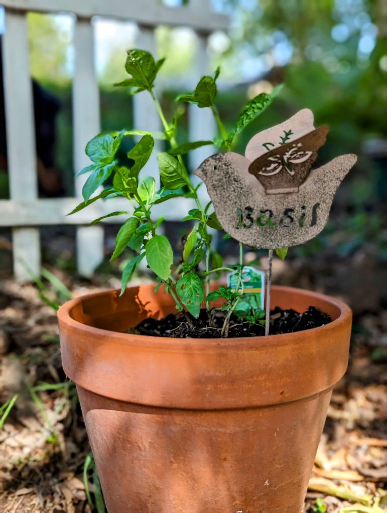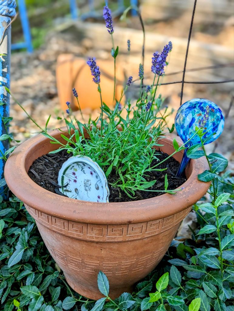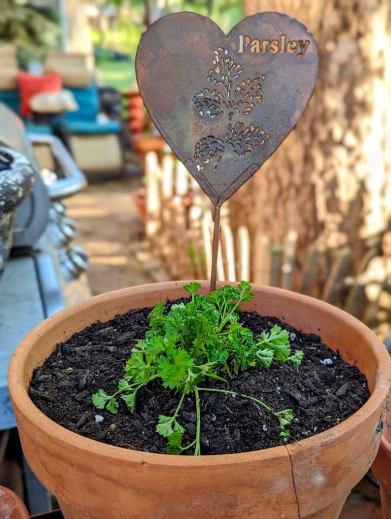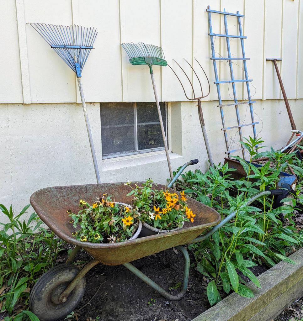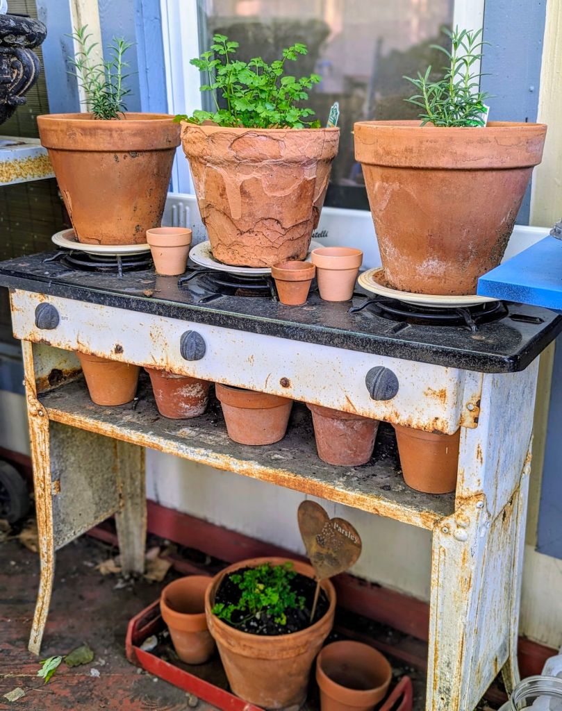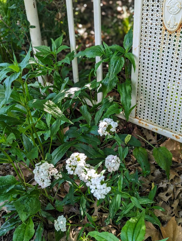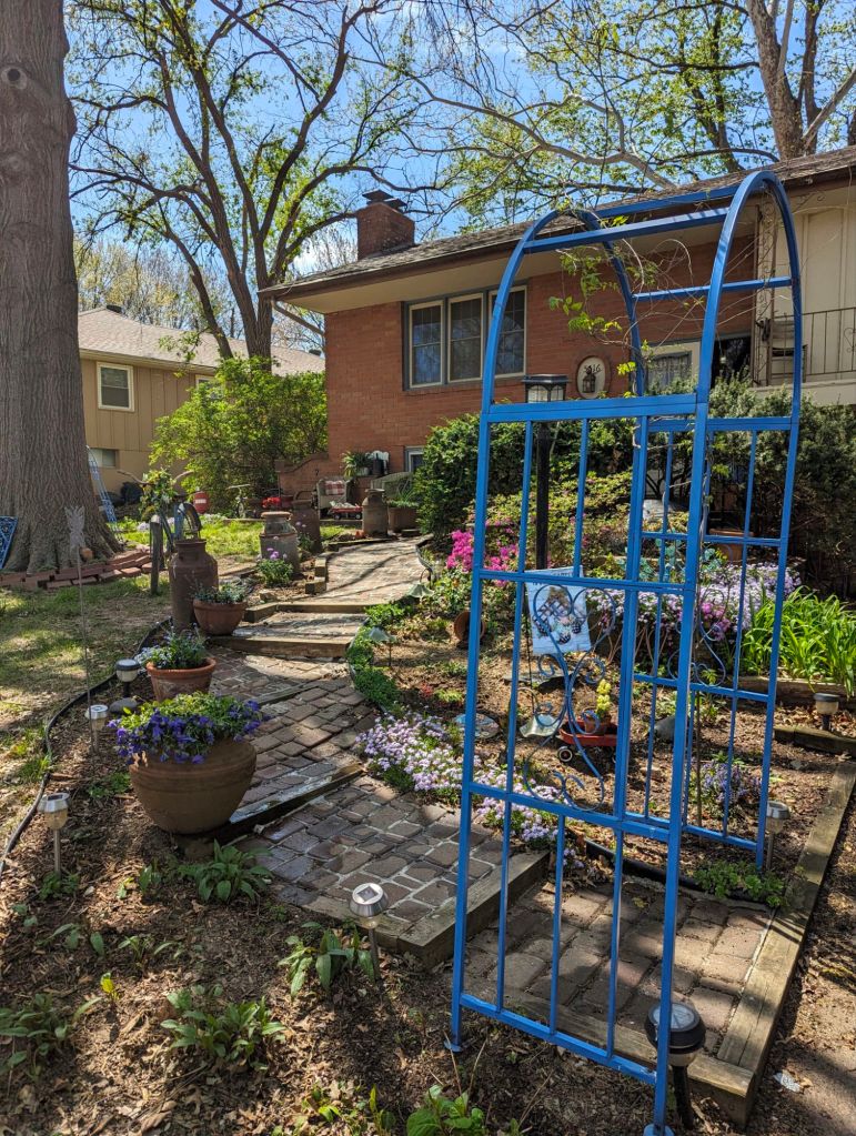 Nothing draws you in like a bright blue arbor and winding brick path! Perfect for Easter and April visitors!Lots of pretty colors from the Phlox, Violas, Azaleas! I found a couple perennial Forget-me-not plants to put in gifted clay pots along the pathway.Notice the difference between April and May? The arbor is quickly filling in with Wisteria. I’m hopeful that this year we’ll finally have wisteria blooms.A few vintage pieces to add whimsy, color and charm to our cottage! The wheelbarrow needs flowers still; I prefer potted plants to prolong the life of the wheelbarrow. The lamp stand used to adorn a backyard garden, but it’s perfect for this echinacea patch. Soon, I’ll add a little flag for a patriotic touch.I have 5 wagons in the front yard, our welcome wagons. This flag was irresistible with the WELCOME message. Potted snapdragons add color in this space till the perennials bloom. I’m proud as a peacock over this beauty found in a heap of treasures headed to the dump. She lights up too!Doesn’t this beckon you to come sit for a bit?! I hope so! Every garden needs places to sit. I call this garden on the side of our house Wild Side garden. It was started with a few mixed packages of wildflower seeds 5 years ago. It is just beginning to bloom for this season. It blooms from late Spring through Fall. Sweet Williams, Coreopsis, Daisies, and Purple Coneflowers are some of the wild residents here.These Sweet Williams remind me of snowballs! The rusty headboard is a prized ReStore score.Sweet Williams don many beautiful Spring colors. I am always surprised that people are unfamiliar with them, considering how easy they are to grow. They self-sow as well. I still need to clean out the leaves from this garden to ensure seeds will find a new home, landing on soil.Sweet Williams look especially beautiful in bouquets. I save empty food jars… salsa, spaghetti sauce, lattes, etc. to use for backyard bouquets. I usually wrap the jar with ribbon or lace tied in a bow. They end up displayed on my kitchen window ledge for viewing while doing dishes… or given to friends and neighbors.Coreopsis is another favorite of mine. It too self-sows. Mine like to hang over the bed and sow future plants in the grass. I dig them up and transplant them. They are biennials, blooming in their second year.A potted petunia plant fits just right in this vintage Cyclone spreader. I never pay more than a few dollars at estate sales for goodies like this red cutie. Most people would never consider repurposing it into a planter. Isn’t it adorable?!Our welcome wagon is getting ready for a bit of red, white and blue. Memorial Day weekend will be here soon. This Geranium looks happy…so far. In past years, Geraniums didn’t like me. They had a change of heart after I bought a sad clearance Geranium for 25¢ and nursed it back to health.I enjoy collecting vintage fishing items. Occasionally, I find a bargain at an estate sale. I call this our Fishers of Men front porch display.This is a May view of our Fishers of Men container garden. It is such a fun little porch display! My friend and mentor, Lisa, made the Bible verse sign for me. It’s perfect! I keep it under the blue bench to protect it from rain. I like to add vintage items to my potted plants for unexpected garden whimsy. I prefer Violas to Pansies because they endure heat better, lasting longer into the summer.Every Spring I scoop up a bunch of hanging flower baskets on sale for around $5. They add a bit of color till the gardens are in full bloom. This purple Petunia fit right inside an old $1 fishing basket.Adding a thrifted teacup and saucer to these potted Violas is a charming cottage touch guaranteed to make others smile.This is my Shady Things Happen Here garden. We have struggled to grow grass in this area, so I am trying to convince my husband on the idea of covering it in mulch with a rock border. I think a dry creek would look beautiful to the right of the tree. Gardens often start with a vision and then somehow take on a mind of their own. I try to be attentive and listen. It’s less work in the end!This is my Pickin’ Patch. It is filled with vintage gardening tools that we picked on thrifting adventures… rakes, wheelbarrow, spreader, push mower, and even a plow, which you can’t see in this picture. There are a couple more rakes to the left, out of the picture, including my favorite red rake. I planted a mixed packet of seeds in this spot last year and am excited to see what blooms this year. A once clearance shelf Clematis now takes hold of an old mattress coil. Notice how it grabs onto the metal H as well. I call this garden area Tea for Two.This pale lavender bloom is a complete surprise, waiting a couple years before finally blooming. This is my idea of a flea market garden!A bistro table beside this garden is the perfect place to sip tea and capture the view!Splish Splash! This old claw foot tub found at ReStore is such a fun repurposed garden! Last Fall I planted bulbs and covered them with BBQ grills to keep the squirrels away. Tulip blooms in April and Alliums in May!We have a visitor! The rusty rake heads found on a FREE table at a garage sale keep the pesky squirrels from digging and destroying.At my previous home, purple Dame Rockets adorned my Spring garden. They are still one of my favorites. Two years ago I sowed quite a few seeds and was disappointed when nothing happened. This beauty surprised me this year. What a blessing!Purple Dame Rockets make such a pretty wildflower bouquet!I purchased the old rocker on clearance day at an estate sale. This is my new morning spot, amidst flowers, bees, butterflies and singing birds.Isn’t this old kerosene stove perfect for potted herbs?!!! We found it at a yard sale deep in the city. I’m smitten!The metal plant markers are gifts from loved ones. I like a little something extra paired with my plants.Basil is a wonderful herb to grow and tastes delicious in homemade pesto, a 