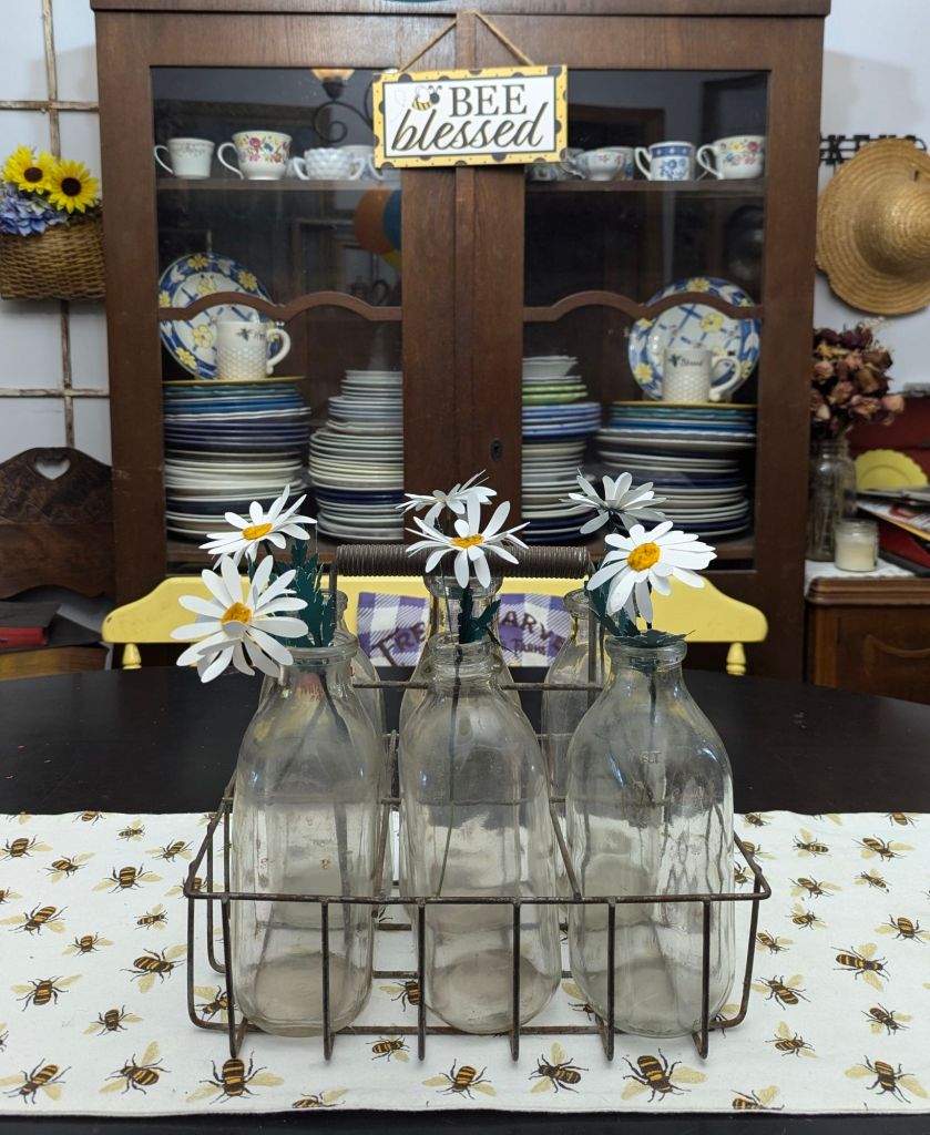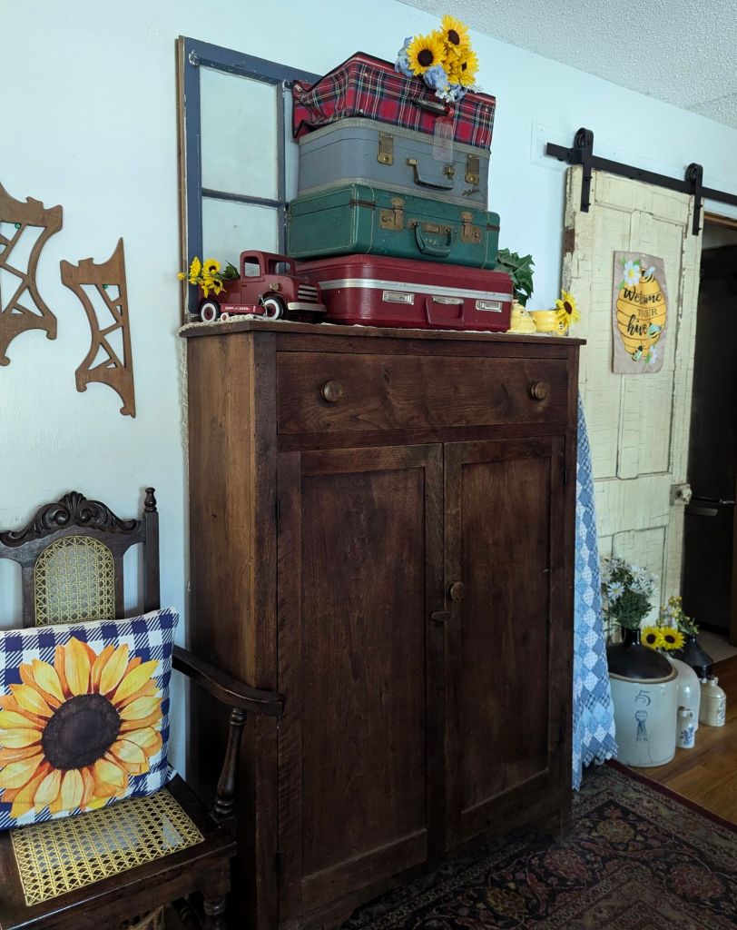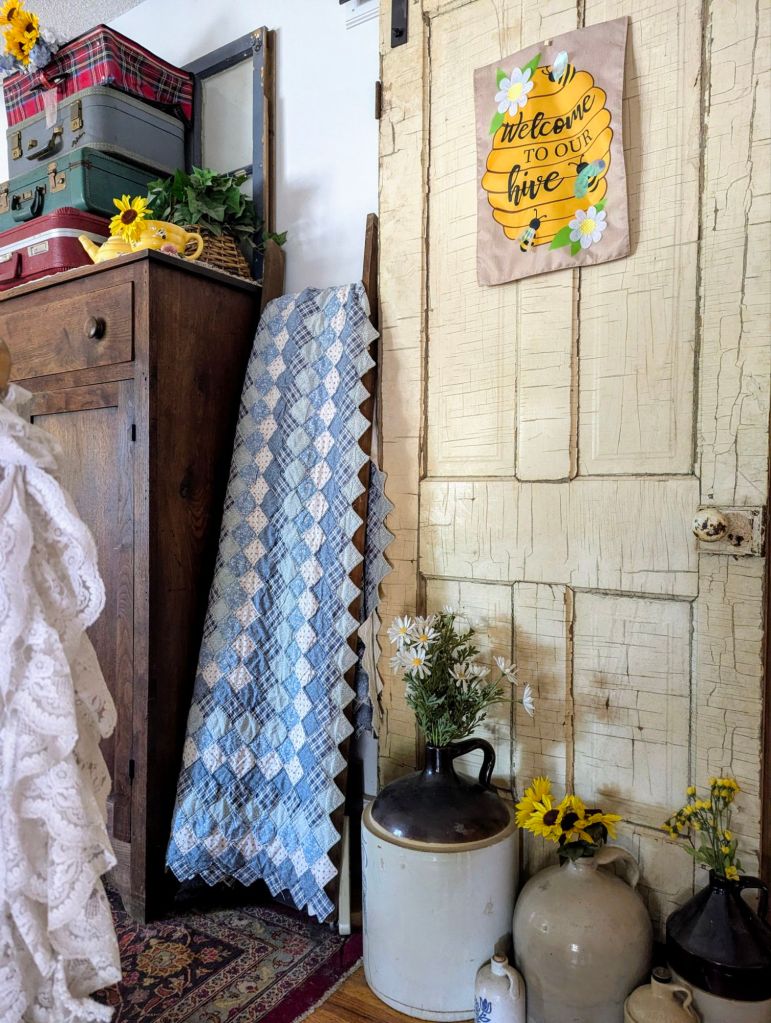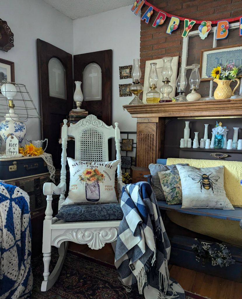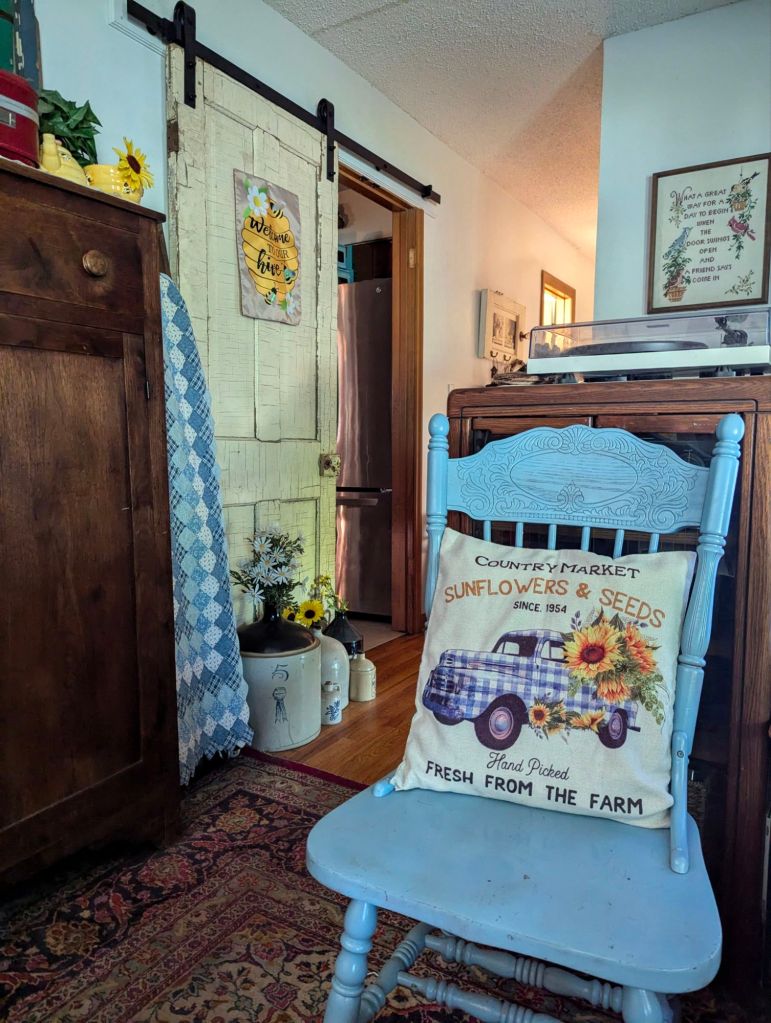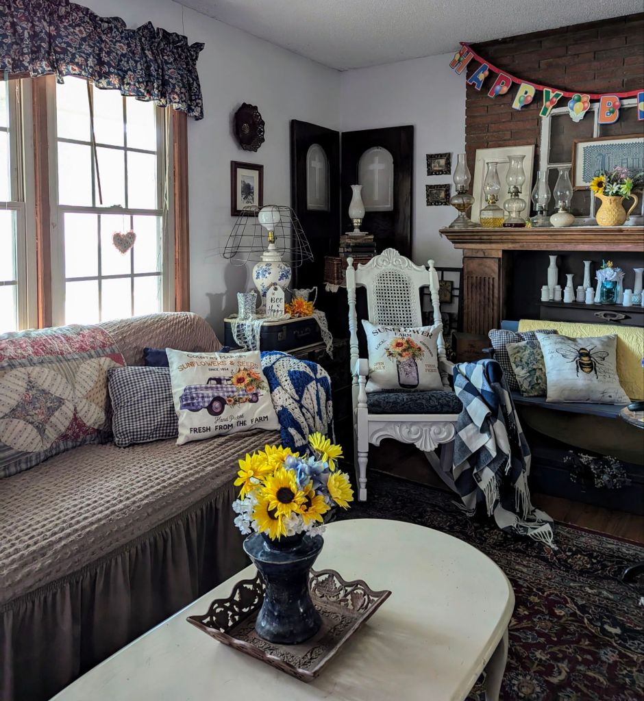 The driveway is flanked with wildflowers and a bit of garden whimsy. Currently, the bees are loving the purple coneflowers. An old lamp stand looks adorable holding a watering can full of sunflowers. The blue arbor draws visitors up the winding brick path.A front garden isn’t complete without a welcome wagon and flag. Blue gingham with a sunflower are a sweet way to greet family and friends. The sunflower watering can is an irresistible estate sale find.Plants and vintage treasures border the pathway. I’m better at growing flowers than grass. Maybe we should just widen the border…all flowers, no grass!π Did you notice my rusty blue vintage bicycle?! It’s adorned with a sunflower and blue floral wreath, my favorite color combination for this decor theme.Our home has a large roof overhang. I dream one day of having a country style porch all along the front of our house, underneath the overhang. For now, I decorate the area with seating and all kinds of goodies. The red pick-up truck is carrying a big load of sunflowers.We have a small front stoop, but I do my best to make good use of the spaces beside it, protected by our large roof overhang. I enjoy displaying faux flowers in the old mop bucket, including sunflowers from the dollar store. Don’t discard your old wagons; they make great displays, as do broken terra cotta pots. This one is home to a little fairy garden.Our porch might be small, but it still has room for an old wicker chair and floral displays. Walmart sells some of the cutest bee themed pillows. This one is no exception. I’m always on the lookout for bargain bee decor. The Let’s Bee Friends metal sign was a great find.Our home has that notorious split-level entry foyer, where one must immediately choose to go up or down. It’s adorned with Grandma Mamie’s original scales of justice quilt design. The thrifted sunflowers in a Guys Potato Chips tin add a fun pop of color.The top of our landing gets a makeover as well, following the theme of sunflowers and bees. Welcome to our hive! A happy greeting as you enter our living room!If you’ve never shopped at ReStore, then you are missing out on all kinds of bargain treasures! The yellow coffee set adorned with bees is a ReStore score.Sunflowers keep popping up everywhere! Search blue gingham and sunflowers on the internet; you will be delighted to find all kinds of goodies, from dishes to pillow covers. I am a fan of pillow covers to save space, storing them right here in this antique pie cabinet.A $1 clearance chair from ReStore is given new life with a fresh coat of French blue paint and a pillow cover sporting blue gingham and sunflowers.Now this is my style… cozy cottage! I want my home to feel warm, welcoming and COMFY.This cozy corner is a favorite spot for relaxing. Blue and yellow, paired with sunflowers and bees, tie it all together.Stacking, grouping and propping are wonderful ways to create little vignettes. The Bee Happy sign is a dollar store find.The oil lamp and milk glass collections are year round displays. Adding touches of blue and yellow, along with sunflower and bee decor, transform this space into a summery cottage haven.The honeycomb bee vase filled with faux wild and sunflowers is one of my favorites. It is an eye-catcher and sits center stage on our mantle.Check out the bee table runner. Bee-utiful!The Bee Blessed sign is one of my hubby’s finds, especially for me, from a flea market while vacationing. He knows my style!Both the bee mugs and plates displayed in the antique cabinet are from ReStore… just 50Β’ each! Our corner dining room cabinet is a favorite to decorate. The back of the shelves are lined with a $1 roll of blue check wallpaper from ReStore. A few honey pots, bees and flowers add pops of yellow.This corner cabinet is buzzing with joy!The whimsical bee lights, a gift from my daughter, bring smiles to all. The vintage framed chalkboard gets a special b-day/bee-day message for loved ones. A simple sunflower adds to the love.Worn old boots make the perfect vase for displaying sunflowers! This old shoe shine display adds whimsy and delight to the end of a long hallway.The summer hutch theme is a garden party. Imagine my delight when I discovered this blue gingham cookbook at an estate sale! Perfect!Not only does this darling Church Suppers cookbook have blue gingham, but it also has sunflowers. It’s worthy of being displayed.I like to use faux flowers as much as fresh flowers when decorating. Pesky squirrels have hindered me from growing sunflowers in my cottage gardens, eating them all… every single time. This adorable casserole dish gets lots of use in the summer. I scored a set of these blue gingham and sunflower dishes at a rural barn sale. This sunflower cutie is a ReStore score and matches the casserole dishes. I’ve yet to find her a matching mate.We own a 1940’s bright red refrigerator and use it to keep beverages cold when entertaining. Sunflowers hanging over the old soda crates add to the nostalgic fun.You’ve seen sunflowers, bees and lots of blue from our curb to our kitchen. Why stop there! Our backyard is a peaceful haven and gets a bit of decorating as well. The theme of sunflowers and bees continues.This is the perfect place for morning coffee! I use pillow covers to decorate cozy spaces outside. At the end of the season, I throw them in the washer.The greenhouse always gets a glam makeover. The bee doormat is buzzing with cuteness. It’s a clearance find.Let It Bee… a dollar store goodie! Everything else is from thrift stores and estate sales. Decorating with sunflowers and bees does not have to bee π costly.My younger daughter’s childhood bike sprayed Wildflower Blue and adorned in sunflowers!The same Wildflower Blue paint color looks blue-tiful on a vintage chandelier. The sunflowers can be changed using other seasonal flowers throughout the year. I collect old mailboxes. This one rests on a vintage screen door frame. It’s the perfect