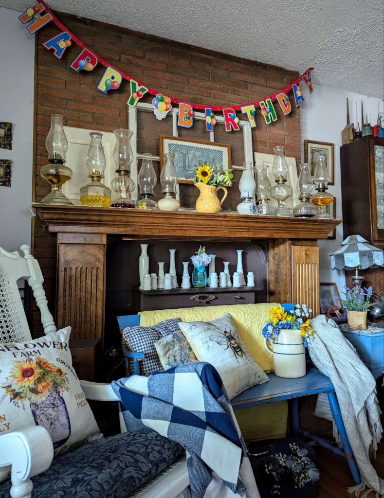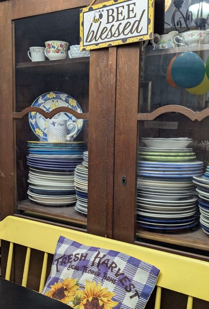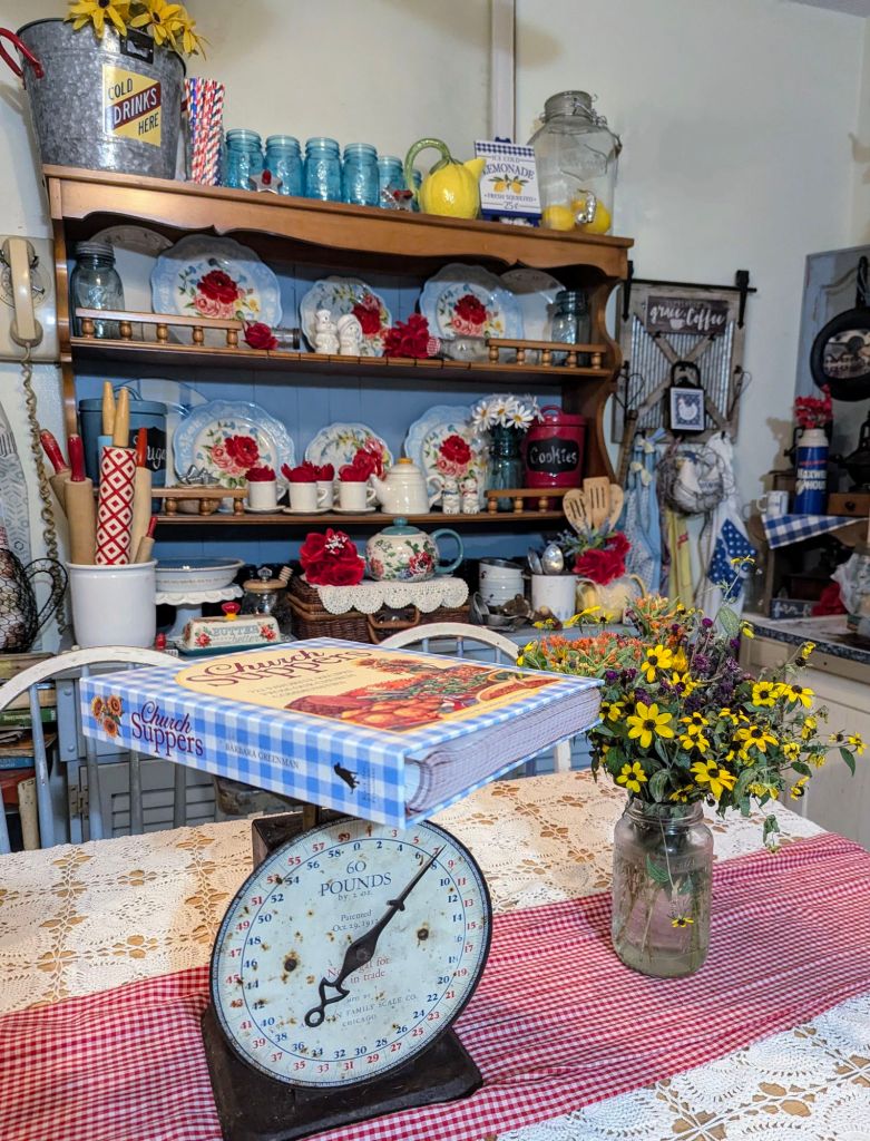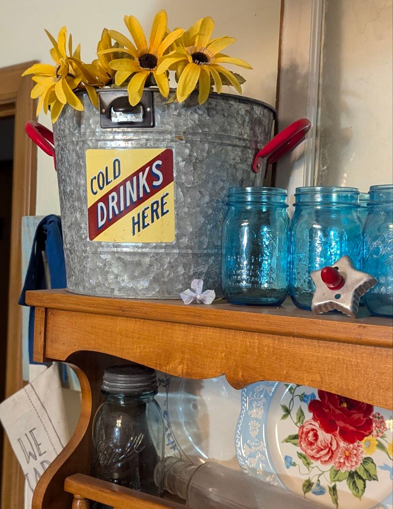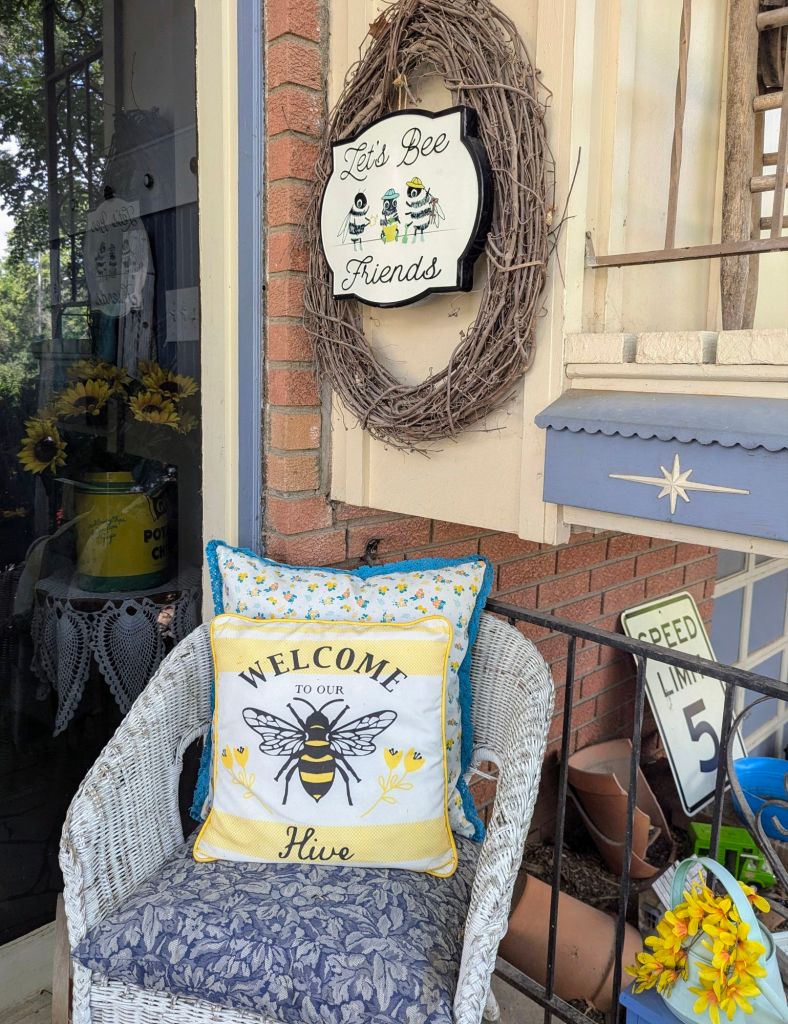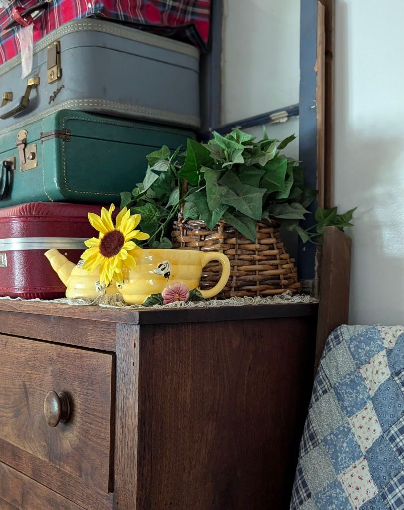 The driveway is flanked with wildflowers and a bit of garden whimsy. Currently, the bees are loving the purple coneflowers. An old lamp stand looks adorable holding a watering can full of sunflowers. The blue arbor draws visitors up the winding brick path.A front garden isn’t complete without a welcome wagon and flag. Blue gingham with a sunflower are a sweet way to greet family and friends. The sunflower watering can is an irresistible estate sale find.Plants and vintage treasures border the pathway. I’m better at growing flowers than grass. Maybe we should just widen the border…all flowers, no grass!π Did you notice my rusty blue vintage bicycle?! It’s adorned with a sunflower and blue floral wreath, my favorite color combination for this decor theme.Our home has a large roof overhang. I dream one day of having a country style porch all along the front of our house, underneath the overhang. For now, I decorate the area with seating and all kinds of goodies. The red pick-up truck is carrying a big load of sunflowers.We have a small front stoop, but I do my best to make good use of the spaces beside it, protected by our large roof overhang. I enjoy displaying faux flowers in the old mop bucket, including sunflowers from the dollar store. Don’t discard your old wagons; they make great displays, as do broken terra cotta pots. This one is home to a little fairy garden.Our porch might be small, but it still has room for an old wicker chair and floral displays. Walmart sells some of the cutest bee themed pillows. This one is no exception. I’m always on the lookout for bargain bee decor. The Let’s Bee Friends metal sign was a great find.Our home has that notorious split-level entry foyer, where one must immediately choose to go up or down. It’s adorned with Grandma Mamie’s original scales of justice quilt design. The thrifted sunflowers in a Guys Potato Chips tin add a fun pop of color.The top of our landing gets a makeover as well, following the theme of sunflowers and bees. Welcome to our hive! A happy greeting as you enter our living room!If you’ve never shopped at ReStore, then you are missing out on all kinds of bargain treasures! The yellow coffee set adorned with bees is a ReStore score.Sunflowers keep popping up everywhere! Search blue gingham and sunflowers on the internet; you will be delighted to find all kinds of goodies, from dishes to pillow covers. I am a fan of pillow covers to save space, storing them right here in this antique pie cabinet.A $1 clearance chair from ReStore is given new life with a fresh coat of French blue paint and a pillow cover sporting blue gingham and sunflowers.Now this is my style… cozy cottage! I want my home to feel warm, welcoming and COMFY.This cozy corner is a favorite spot for relaxing. Blue and yellow, paired with sunflowers and bees, tie it all together.Stacking, grouping and propping are wonderful ways to create little vignettes. The Bee Happy sign is a dollar store find.The oil lamp and milk glass collections are year round displays. Adding touches of blue and yellow, along with sunflower and bee decor, transform this space into a summery cottage haven.The honeycomb bee vase filled with faux wild and sunflowers is one of my favorites. It is an eye-catcher and sits center stage on our mantle.Check out the bee table runner. Bee-utiful!The Bee Blessed sign is one of my hubby’s finds, especially for me, from a flea market while vacationing. He knows my style!Both the bee mugs and plates displayed in the antique cabinet are from ReStore… just 50Β’ each! Our corner dining room cabinet is a favorite to decorate. The back of the shelves are lined with a $1 roll of blue check wallpaper from ReStore. A few honey pots, bees and flowers add pops of yellow.This corner cabinet is buzzing with joy!The whimsical bee lights, a gift from my daughter, bring smiles to all. The vintage framed chalkboard gets a special b-day/bee-day message for loved ones. A simple sunflower adds to the love.Worn old boots make the perfect vase for displaying sunflowers! This old shoe shine display adds whimsy and delight to the end of a long hallway.The summer hutch theme is a garden party. Imagine my delight when I discovered this blue gingham cookbook at an estate sale! Perfect!Not only does this darling Church Suppers cookbook have blue gingham, but it also has sunflowers. It’s worthy of being displayed.I like to use faux flowers as much as fresh flowers when decorating. Pesky squirrels have hindered me from growing sunflowers in my cottage gardens, eating them all… every single time. This adorable casserole dish gets lots of use in the summer. I scored a set of these blue gingham and sunflower dishes at a rural barn sale. This sunflower cutie is a ReStore score and matches the casserole dishes. I’ve yet to find her a matching mate.We own a 1940’s bright red refrigerator and use it to keep beverages cold when entertaining. Sunflowers hanging over the old soda crates add to the nostalgic fun.You’ve seen sunflowers, bees and lots of blue from our curb to our kitchen. Why stop there! Our backyard is a peaceful haven and gets a bit of decorating as well. The theme of sunflowers and bees continues.This is the perfect place for morning coffee! I use pillow covers to decorate cozy spaces outside. At the end of the season, I throw them in the washer.The greenhouse always gets a glam makeover. The bee doormat is buzzing with cuteness. It’s a clearance find.Let It Bee… a dollar store goodie! Everything else is from thrift stores and estate sales. Decorating with sunflowers and bees does not have to bee π costly.My younger daughter’s childhood bike sprayed Wildflower Blue and adorned in sunflowers!The same Wildflower Blue paint color looks blue-tiful on a vintage chandelier. The sunflowers can be changed using other seasonal flowers throughout the year. I collect old mailboxes. This one rests on a vintage screen door frame. It’s the perfect