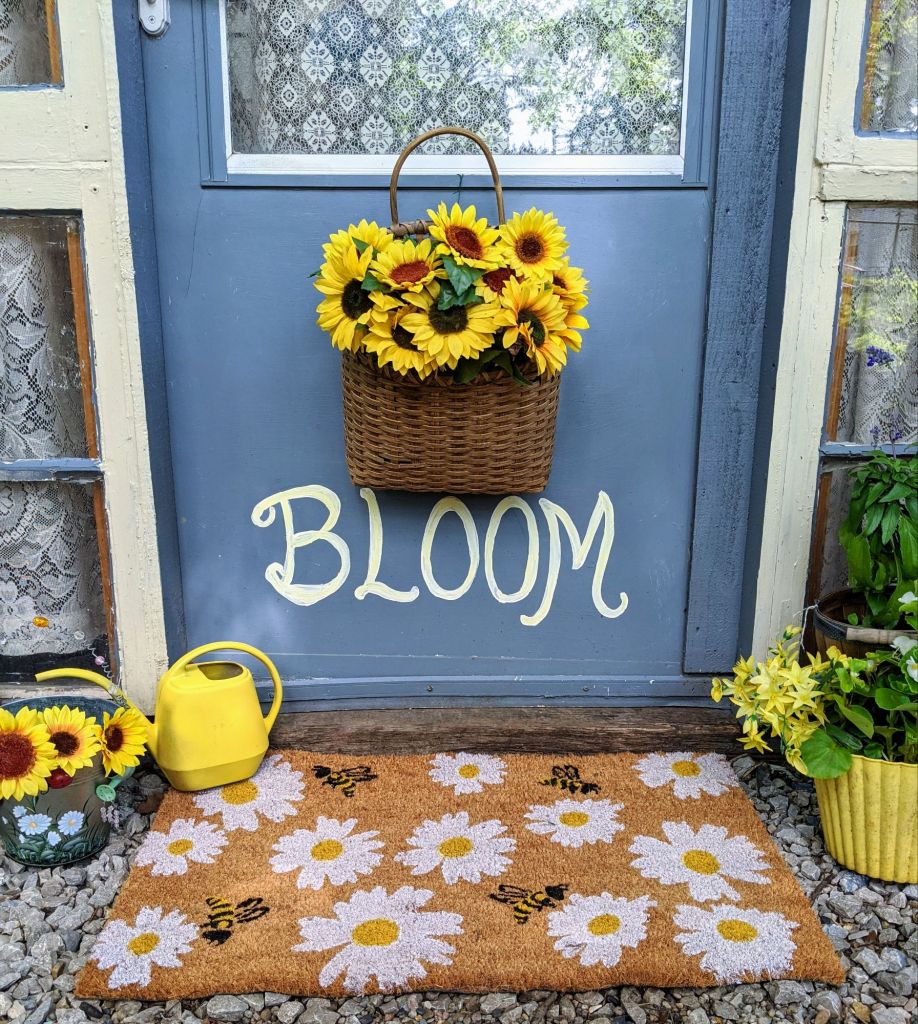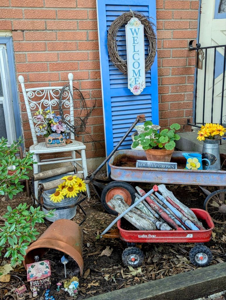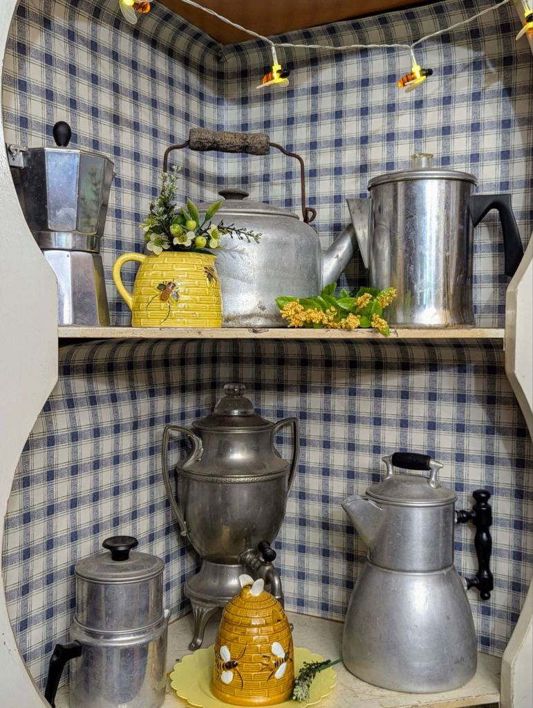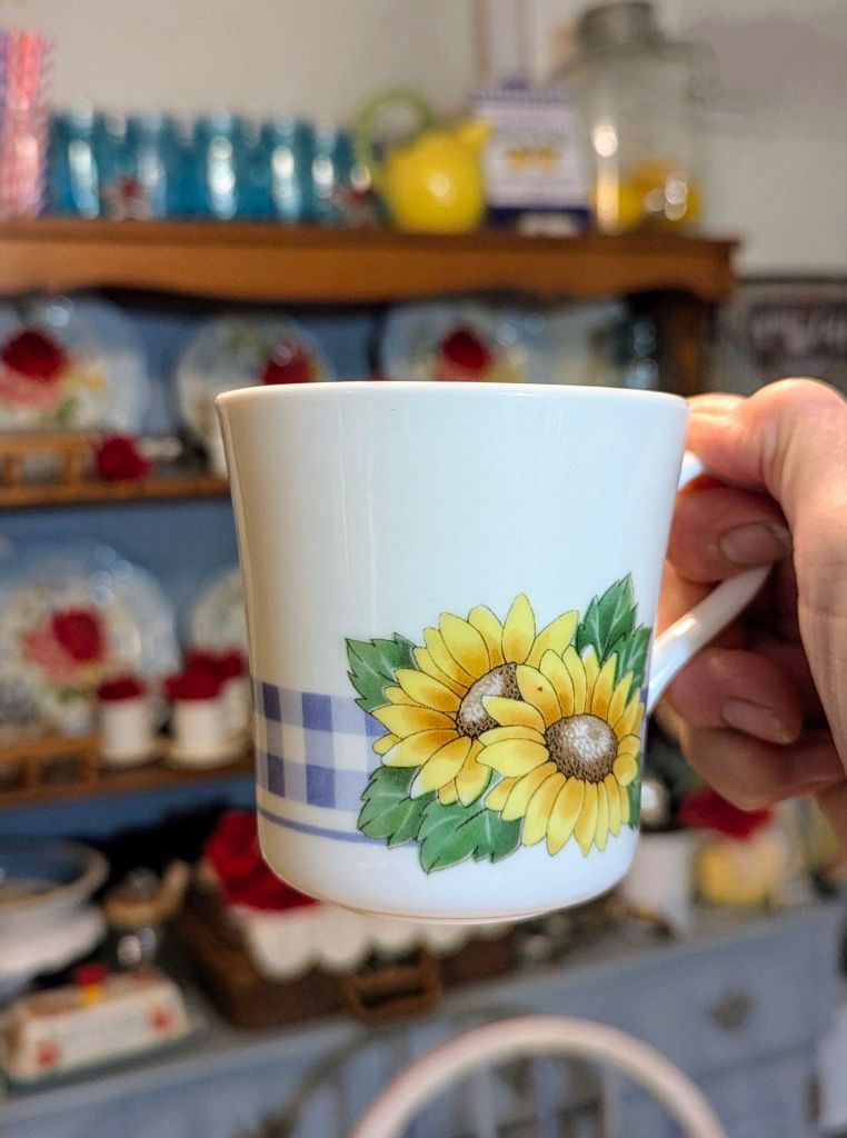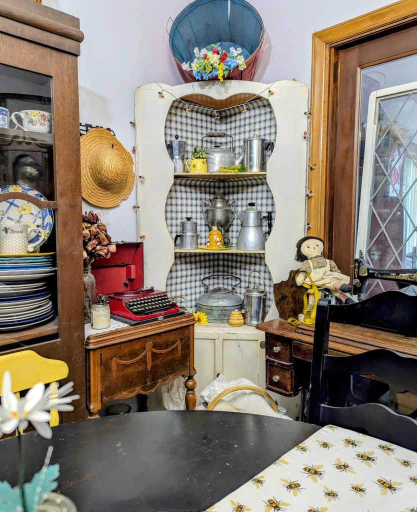 The driveway is flanked with wildflowers and a bit of garden whimsy. Currently, the bees are loving the purple coneflowers. An old lamp stand looks adorable holding a watering can full of sunflowers. The blue arbor draws visitors up the winding brick path.A front garden isn’t complete without a welcome wagon and flag. Blue gingham with a sunflower are a sweet way to greet family and friends. The sunflower watering can is an irresistible estate sale find.Plants and vintage treasures border the pathway. I’m better at growing flowers than grass. Maybe we should just widen the border…all flowers, no grass!π Did you notice my rusty blue vintage bicycle?! It’s adorned with a sunflower and blue floral wreath, my favorite color combination for this decor theme.Our home has a large roof overhang. I dream one day of having a country style porch all along the front of our house, underneath the overhang. For now, I decorate the area with seating and all kinds of goodies. The red pick-up truck is carrying a big load of sunflowers.We have a small front stoop, but I do my best to make good use of the spaces beside it, protected by our large roof overhang. I enjoy displaying faux flowers in the old mop bucket, including sunflowers from the dollar store. Don’t discard your old wagons; they make great displays, as do broken terra cotta pots. This one is home to a little fairy garden.Our porch might be small, but it still has room for an old wicker chair and floral displays. Walmart sells some of the cutest bee themed pillows. This one is no exception. I’m always on the lookout for bargain bee decor. The Let’s Bee Friends metal sign was a great find.Our home has that notorious split-level entry foyer, where one must immediately choose to go up or down. It’s adorned with Grandma Mamie’s original scales of justice quilt design. The thrifted sunflowers in a Guys Potato Chips tin add a fun pop of color.The top of our landing gets a makeover as well, following the theme of sunflowers and bees. Welcome to our hive! A happy greeting as you enter our living room!If you’ve never shopped at ReStore, then you are missing out on all kinds of bargain treasures! The yellow coffee set adorned with bees is a ReStore score.Sunflowers keep popping up everywhere! Search blue gingham and sunflowers on the internet; you will be delighted to find all kinds of goodies, from dishes to pillow covers. I am a fan of pillow covers to save space, storing them right here in this antique pie cabinet.A $1 clearance chair from ReStore is given new life with a fresh coat of French blue paint and a pillow cover sporting blue gingham and sunflowers.Now this is my style… cozy cottage! I want my home to feel warm, welcoming and COMFY.This cozy corner is a favorite spot for relaxing. Blue and yellow, paired with sunflowers and bees, tie it all together.Stacking, grouping and propping are wonderful ways to create little vignettes. The Bee Happy sign is a dollar store find.The oil lamp and milk glass collections are year round displays. Adding touches of blue and yellow, along with sunflower and bee decor, transform this space into a summery cottage haven.The honeycomb bee vase filled with faux wild and sunflowers is one of my favorites. It is an eye-catcher and sits center stage on our mantle.Check out the bee table runner. Bee-utiful!The Bee Blessed sign is one of my hubby’s finds, especially for me, from a flea market while vacationing. He knows my style!Both the bee mugs and plates displayed in the antique cabinet are from ReStore… just 50Β’ each! Our corner dining room cabinet is a favorite to decorate. The back of the shelves are lined with a $1 roll of blue check wallpaper from ReStore. A few honey pots, bees and flowers add pops of yellow.This corner cabinet is buzzing with joy!The whimsical bee lights, a gift from my daughter, bring smiles to all. The vintage framed chalkboard gets a special b-day/bee-day message for loved ones. A simple sunflower adds to the love.Worn old boots make the perfect vase for displaying sunflowers! This old shoe shine display adds whimsy and delight to the end of a long hallway.The summer hutch theme is a garden party. Imagine my delight when I discovered this blue gingham cookbook at an estate sale! Perfect!Not only does this darling Church Suppers cookbook have blue gingham, but it also has sunflowers. It’s worthy of being displayed.I like to use faux flowers as much as fresh flowers when decorating. Pesky squirrels have hindered me from growing sunflowers in my cottage gardens, eating them all… every single time. This adorable casserole dish gets lots of use in the summer. I scored a set of these blue gingham and sunflower dishes at a rural barn sale. This sunflower cutie is a ReStore score and matches the casserole dishes. I’ve yet to find her a matching mate.We own a 1940’s bright red refrigerator and use it to keep beverages cold when entertaining. Sunflowers hanging over the old soda crates add to the nostalgic fun.You’ve seen sunflowers, bees and lots of blue from our curb to our kitchen. Why stop there! Our backyard is a peaceful haven and gets a bit of decorating as well. The theme of sunflowers and bees continues.This is the perfect place for morning coffee! I use pillow covers to decorate cozy spaces outside. At the end of the season, I throw them in the washer.The greenhouse always gets a glam makeover. The bee doormat is buzzing with cuteness. It’s a clearance find.Let It Bee… a dollar store goodie! Everything else is from thrift stores and estate sales. Decorating with sunflowers and bees does not have to bee π costly.My younger daughter’s childhood bike sprayed Wildflower Blue and adorned in sunflowers!The same Wildflower Blue paint color looks blue-tiful on a vintage chandelier. The sunflowers can be changed using other seasonal flowers throughout the year. I collect old mailboxes. This one rests on a vintage screen door frame. It’s the perfect
