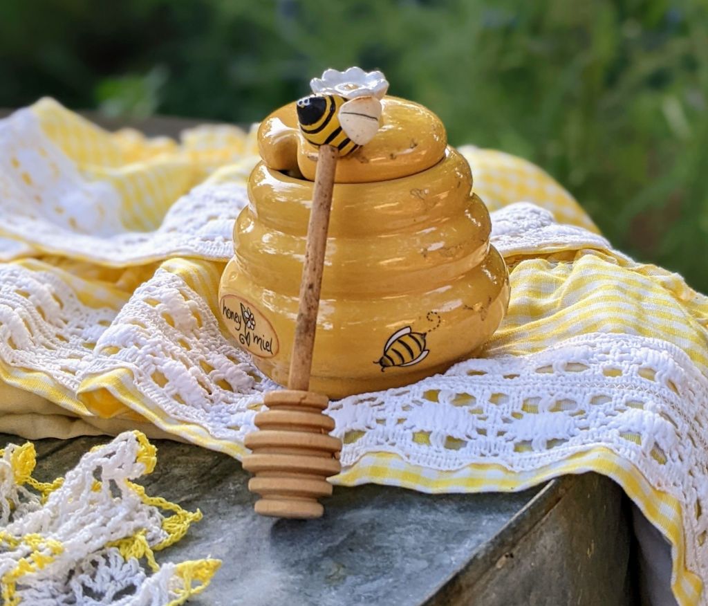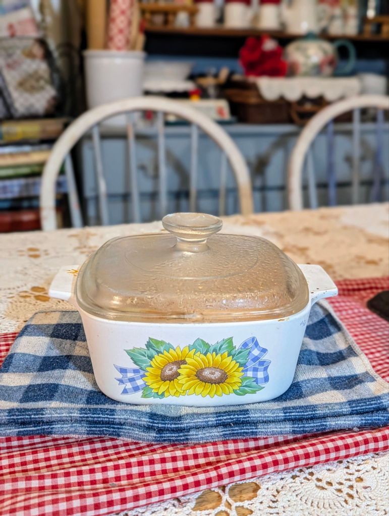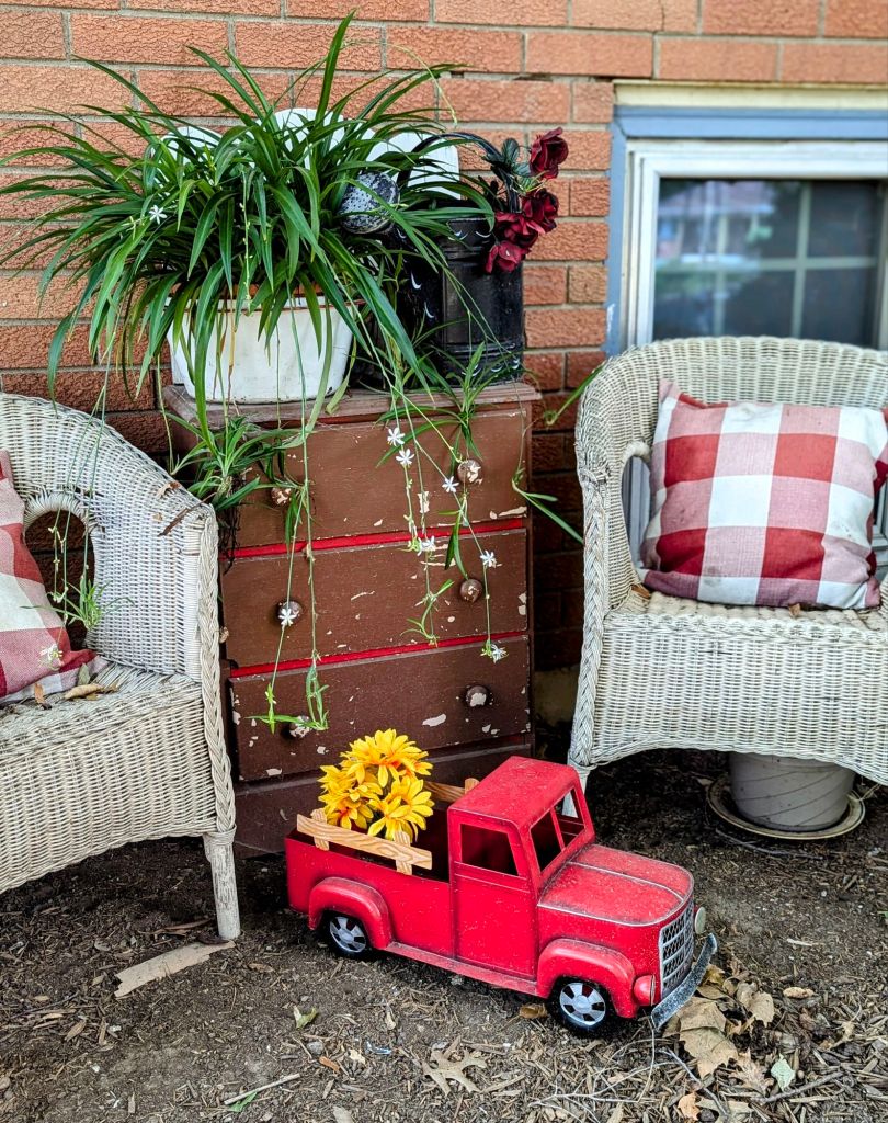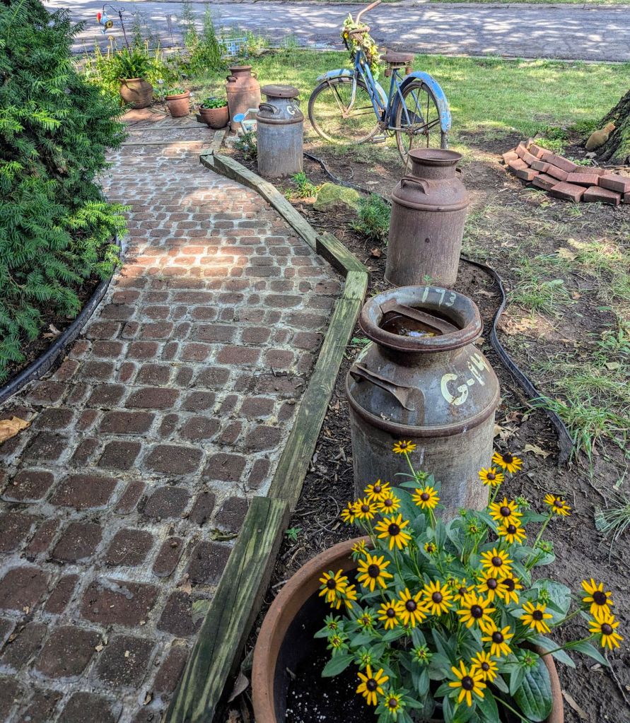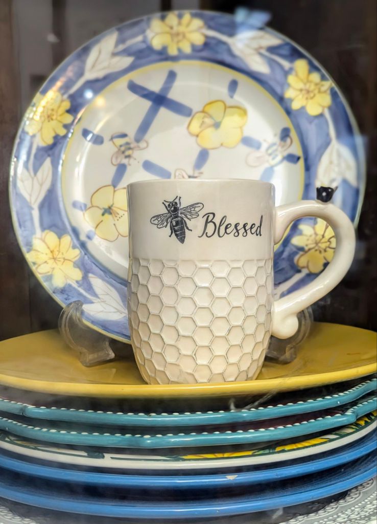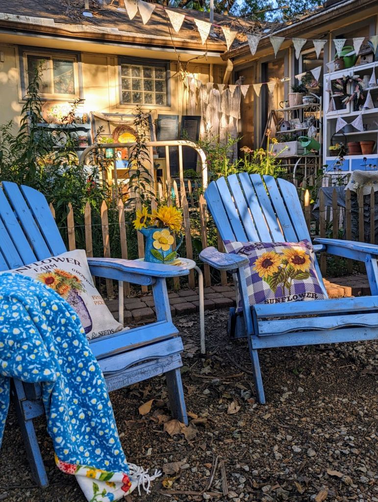 The driveway is flanked with wildflowers and a bit of garden whimsy. Currently, the bees are loving the purple coneflowers. An old lamp stand looks adorable holding a watering can full of sunflowers. The blue arbor draws visitors up the winding brick path.A front garden isn’t complete without a welcome wagon and flag. Blue gingham with a sunflower are a sweet way to greet family and friends. The sunflower watering can is an irresistible estate sale find.Plants and vintage treasures border the pathway. I’m better at growing flowers than grass. Maybe we should just widen the border…all flowers, no grass!π Did you notice my rusty blue vintage bicycle?! It’s adorned with a sunflower and blue floral wreath, my favorite color combination for this decor theme.Our home has a large roof overhang. I dream one day of having a country style porch all along the front of our house, underneath the overhang. For now, I decorate the area with seating and all kinds of goodies. The red pick-up truck is carrying a big load of sunflowers.We have a small front stoop, but I do my best to make good use of the spaces beside it, protected by our large roof overhang. I enjoy displaying faux flowers in the old mop bucket, including sunflowers from the dollar store. Don’t discard your old wagons; they make great displays, as do broken terra cotta pots. This one is home to a little fairy garden.Our porch might be small, but it still has room for an old wicker chair and floral displays. Walmart sells some of the cutest bee themed pillows. This one is no exception. I’m always on the lookout for bargain bee decor. The Let’s Bee Friends metal sign was a great find.Our home has that notorious split-level entry foyer, where one must immediately choose to go up or down. It’s adorned with Grandma Mamie’s original scales of justice quilt design. The thrifted sunflowers in a Guys Potato Chips tin add a fun pop of color.The top of our landing gets a makeover as well, following the theme of sunflowers and bees. Welcome to our hive! A happy greeting as you enter our living room!If you’ve never shopped at ReStore, then you are missing out on all kinds of bargain treasures! The yellow coffee set adorned with bees is a ReStore score.Sunflowers keep popping up everywhere! Search blue gingham and sunflowers on the internet; you will be delighted to find all kinds of goodies, from dishes to pillow covers. I am a fan of pillow covers to save space, storing them right here in this antique pie cabinet.A $1 clearance chair from ReStore is given new life with a fresh coat of French blue paint and a pillow cover sporting blue gingham and sunflowers.Now this is my style… cozy cottage! I want my home to feel warm, welcoming and COMFY.This cozy corner is a favorite spot for relaxing. Blue and yellow, paired with sunflowers and bees, tie it all together.Stacking, grouping and propping are wonderful ways to create little vignettes. The Bee Happy sign is a dollar store find.The oil lamp and milk glass collections are year round displays. Adding touches of blue and yellow, along with sunflower and bee decor, transform this space into a summery cottage haven.The honeycomb bee vase filled with faux wild and sunflowers is one of my favorites. It is an eye-catcher and sits center stage on our mantle.Check out the bee table runner. Bee-utiful!The Bee Blessed sign is one of my hubby’s finds, especially for me, from a flea market while vacationing. He knows my style!Both the bee mugs and plates displayed in the antique cabinet are from ReStore… just 50Β’ each! Our corner dining room cabinet is a favorite to decorate. The back of the shelves are lined with a $1 roll of blue check wallpaper from ReStore. A few honey pots, bees and flowers add pops of yellow.This corner cabinet is buzzing with joy!The whimsical bee lights, a gift from my daughter, bring smiles to all. The vintage framed chalkboard gets a special b-day/bee-day message for loved ones. A simple sunflower adds to the love.Worn old boots make the perfect vase for displaying sunflowers! This old shoe shine display adds whimsy and delight to the end of a long hallway.The summer hutch theme is a garden party. Imagine my delight when I discovered this blue gingham cookbook at an estate sale! Perfect!Not only does this darling Church Suppers cookbook have blue gingham, but it also has sunflowers. It’s worthy of being displayed.I like to use faux flowers as much as fresh flowers when decorating. Pesky squirrels have hindered me from growing sunflowers in my cottage gardens, eating them all… every single time. This adorable casserole dish gets lots of use in the summer. I scored a set of these blue gingham and sunflower dishes at a rural barn sale. This sunflower cutie is a ReStore score and matches the casserole dishes. I’ve yet to find her a matching mate.We own a 1940’s bright red refrigerator and use it to keep beverages cold when entertaining. Sunflowers hanging over the old soda crates add to the nostalgic fun.You’ve seen sunflowers, bees and lots of blue from our curb to our kitchen. Why stop there! Our backyard is a peaceful haven and gets a bit of decorating as well. The theme of sunflowers and bees continues.This is the perfect place for morning coffee! I use pillow covers to decorate cozy spaces outside. At the end of the season, I throw them in the washer.The greenhouse always gets a glam makeover. The bee doormat is buzzing with cuteness. It’s a clearance find.Let It Bee… a dollar store goodie! Everything else is from thrift stores and estate sales. Decorating with sunflowers and bees does not have to bee π costly.My younger daughter’s childhood bike sprayed Wildflower Blue and adorned in sunflowers!The same Wildflower Blue paint color looks blue-tiful on a vintage chandelier. The sunflowers can be changed using other seasonal flowers throughout the year. I collect old mailboxes. This one rests on a vintage screen door frame. It’s the perfect