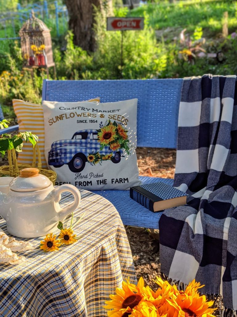 Lovely sunflower and bee theme for late summer decor. Your out door living space is wonderful. Have a blessed week.