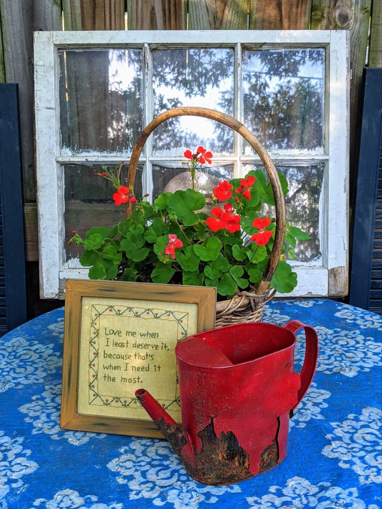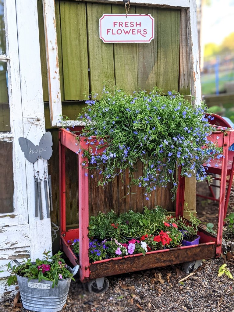 This old tool cart has seen better days! It works so well in creating a little flower stand in the garden seating area. We already owned this red cart, hidden in the basement corner not being used, so I merely shopped my home with a repurposing vision. Nobody puts this repurposed baby in the basement corner!