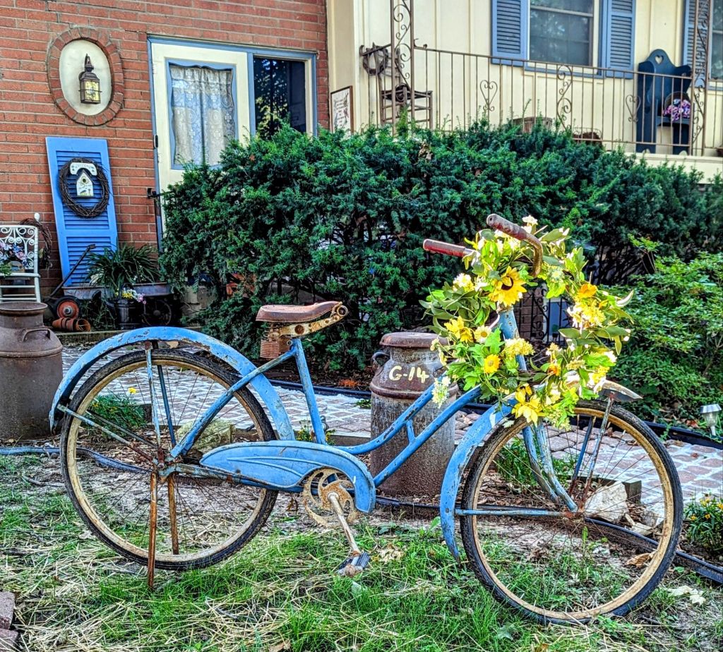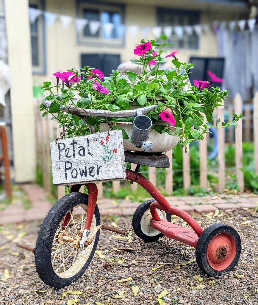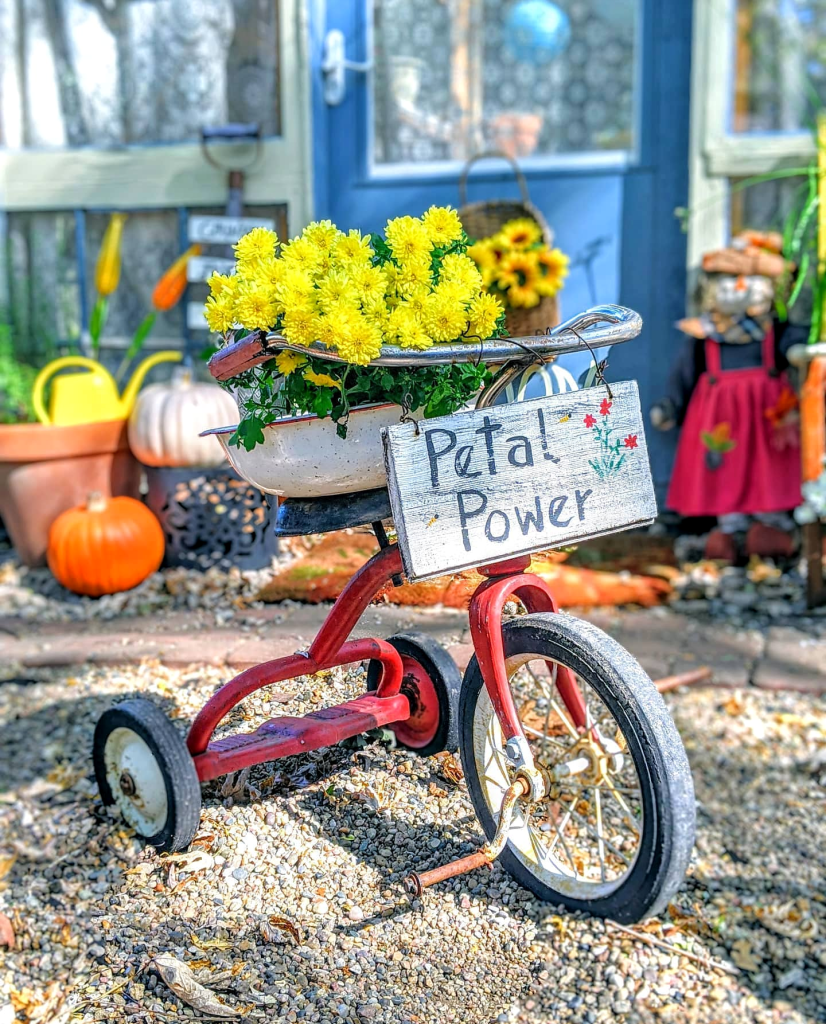 This same trike is caught again upcycling around the garden….. Petal Power! In the Fall, mums look colorful and cute placed in the enamel bowl. Don’t “mums the word” about repurposing an old trike into a planter. Spread the message!