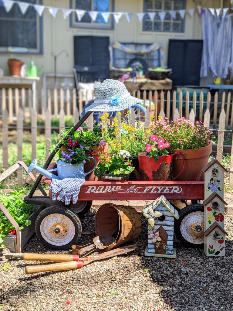A wagon load of Spring blooms adds the perfect country cottage charm to this garden area. Years ago on Instagram I created a wagon decor tour, rounding up friends with wagons. We rolled out our wagons all decorated for various seasons on our social media accounts. #wagondecortour Such a fun way to get the upcycling movement rolling!