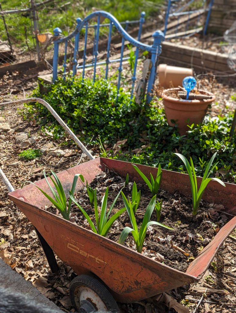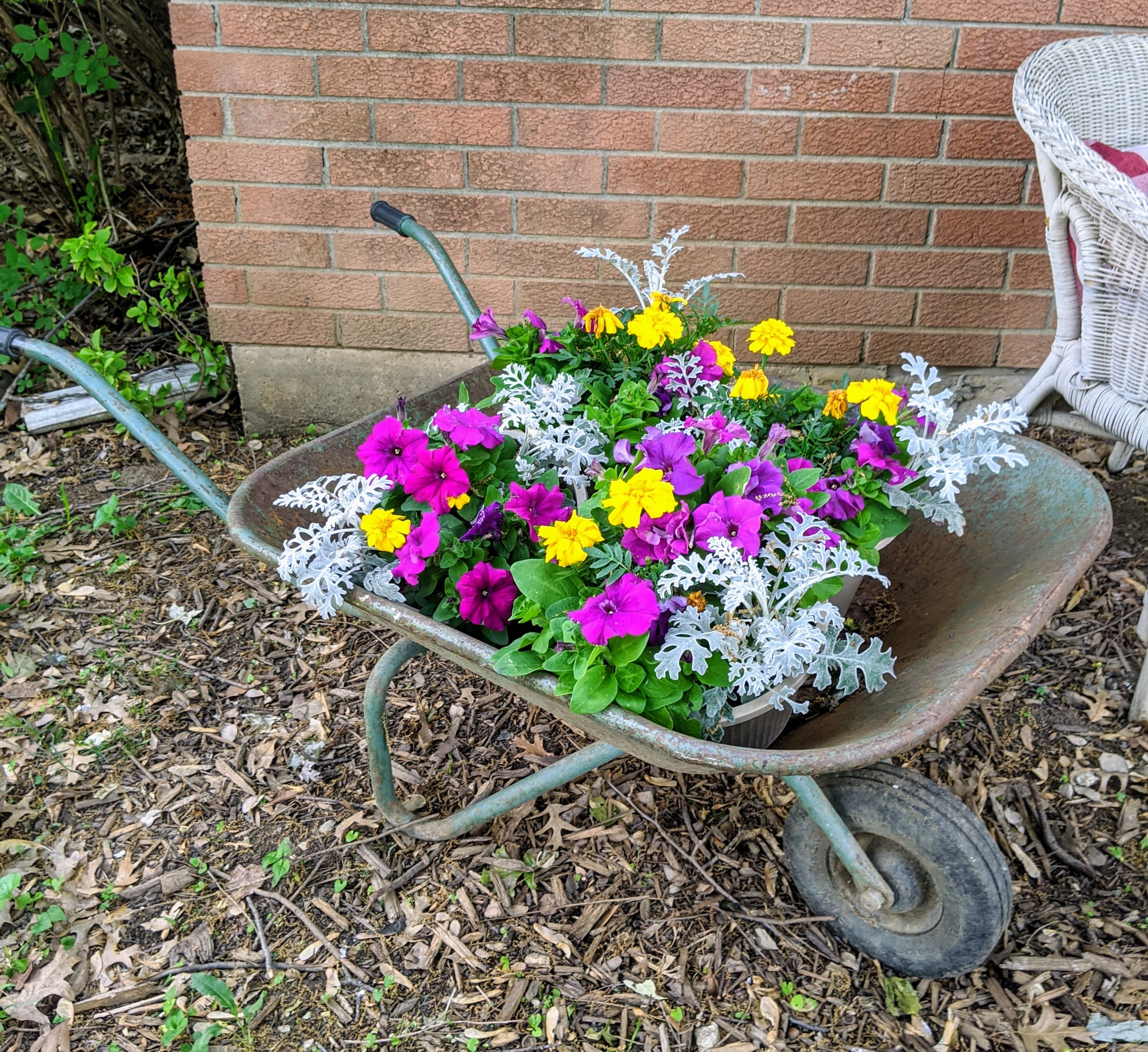 My husband and I visited an estate sale on the last day when items sell for cheap. In the garage, I discovered an old yardwork Cart. I excitedly wheeled it into the living room to pay for it. The woman running the estate sale said I could have that “filthy thing” for free. YES! It’s such a fun planter, quite whimsical. Because of the wheels, it can be moved around, like rearranging furniture in the garden. I fill it with 3 layers: fallen broken limbs, old potting soil, and I save the best soil for last, using new potting soil on top.