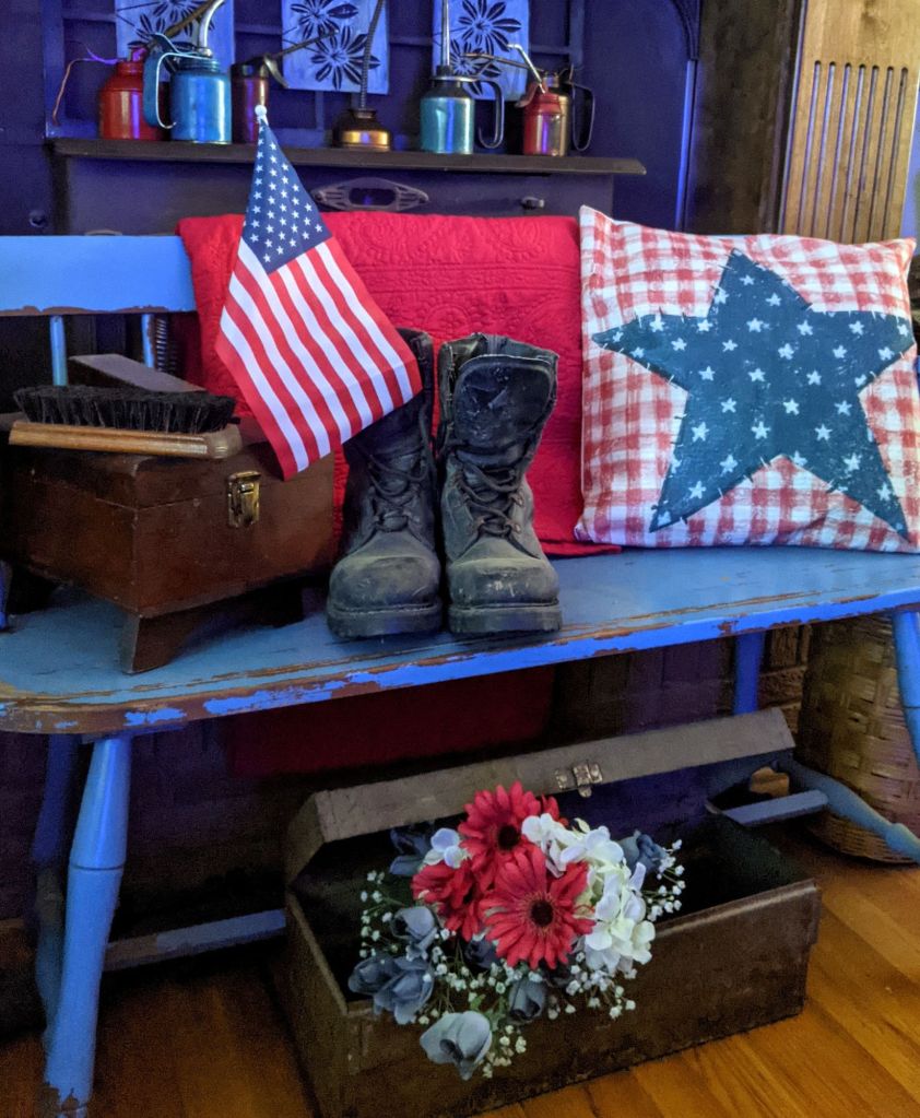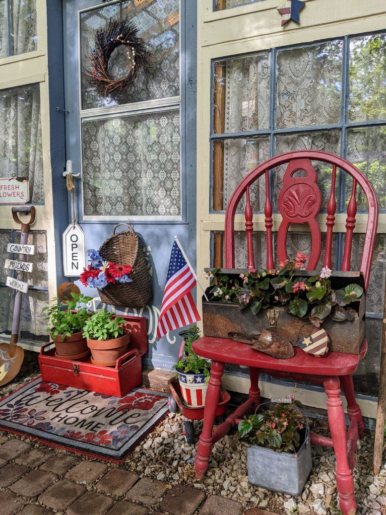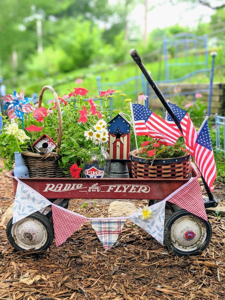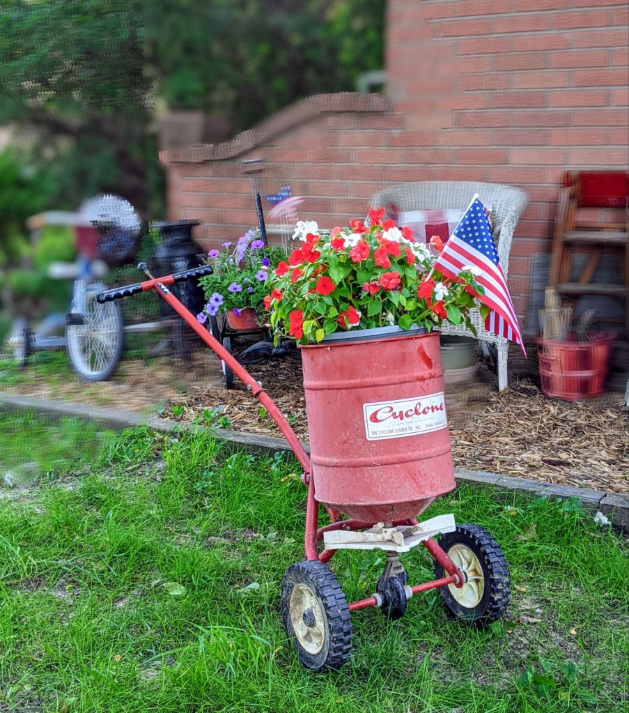 As new seasons roll around, switching out the flowers and decor to match the season creates a darling vignette that neighbors look forward to seeing. For Fourth of July, red, white and blue blooms, along with flags adorn this cute wagon. This was my grown children’s childhood wagon. It rolls on as a repurposed planter.