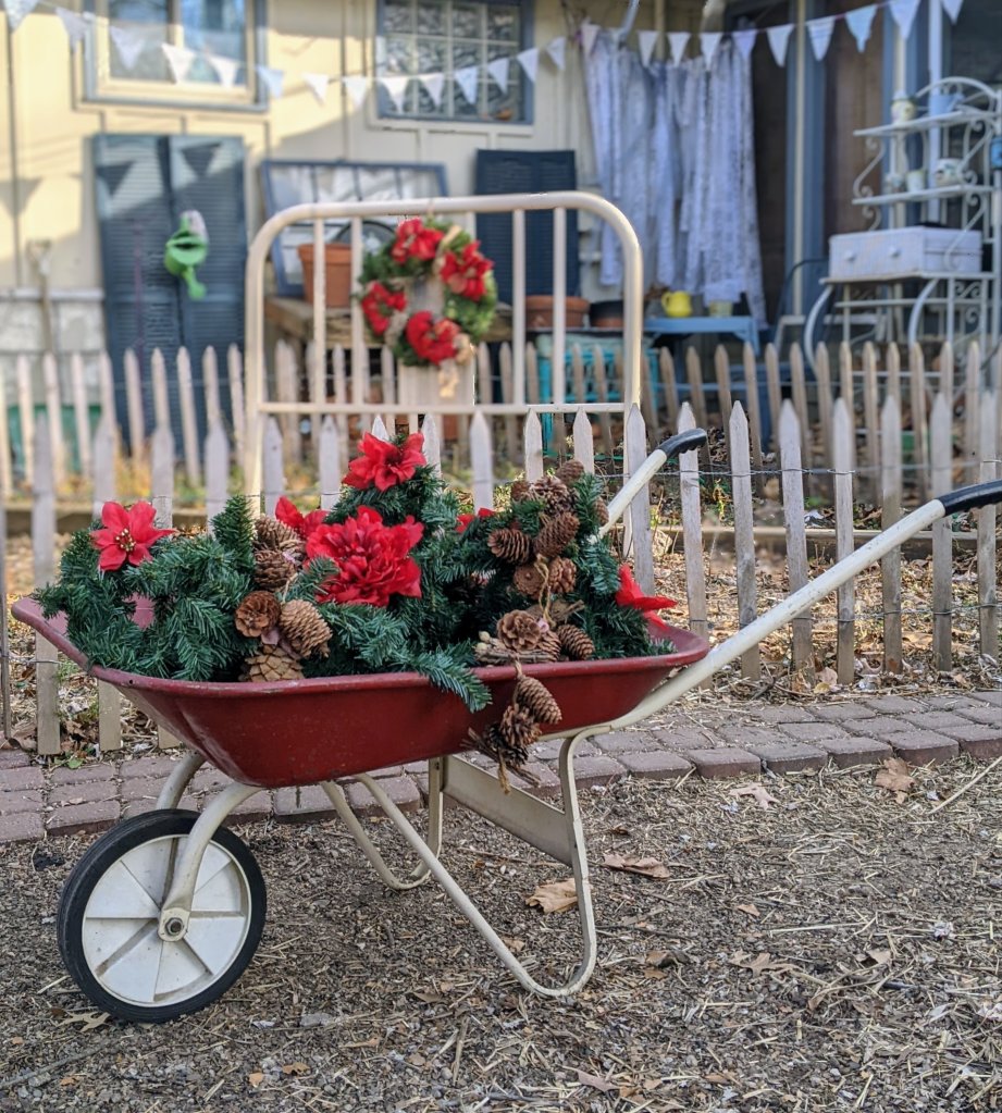 Why stop with one wheelbarrow when you find another one at an estate sale for CHEAP! I’m quite fond of red! Isn’t this a lovely colorful view?!!! Red works well for various holiday displays.