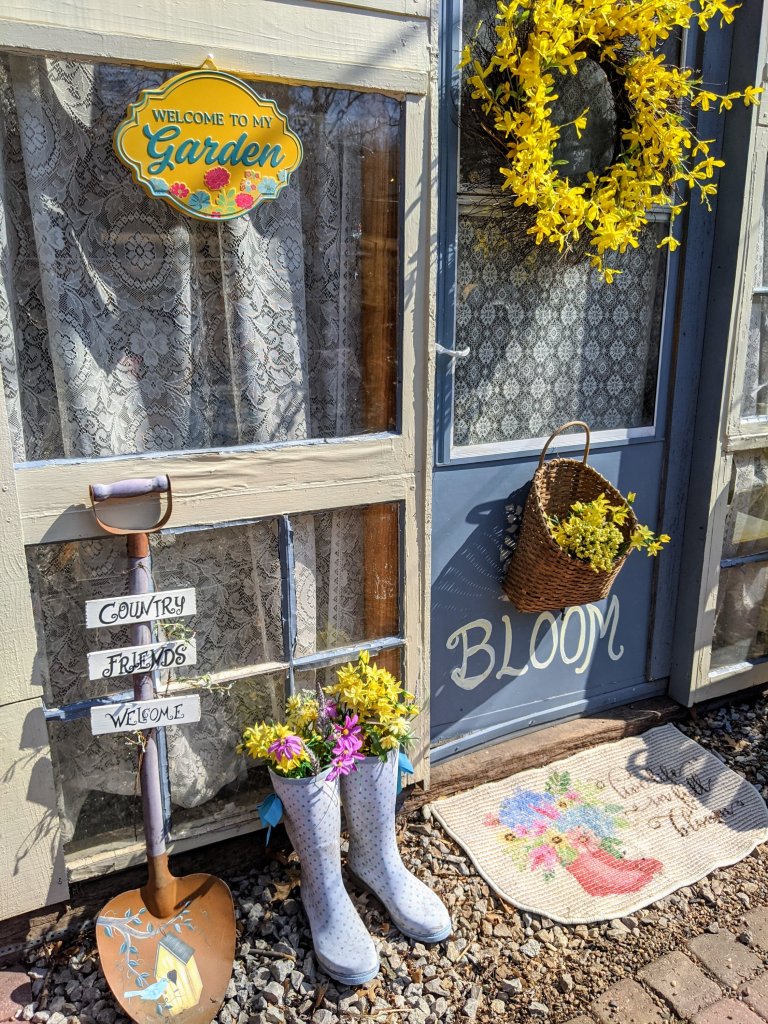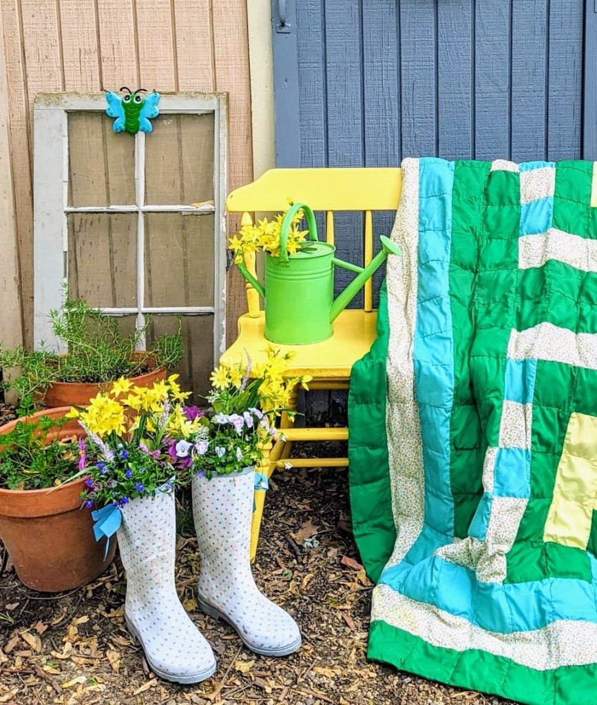 I look forward to decorating our yard for Spring. Before the real flowers even begin to bloom, I use faux flowers. Rain boots filled with colorful flowers add whimsy and cheer.