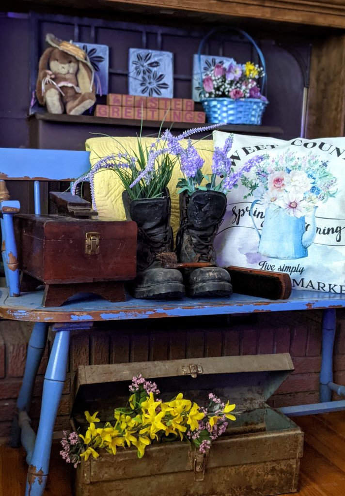 I upcycled these old combat boots by repurposing them as planters. They make an even better display paired with my husband’s vintage shoe shine box!