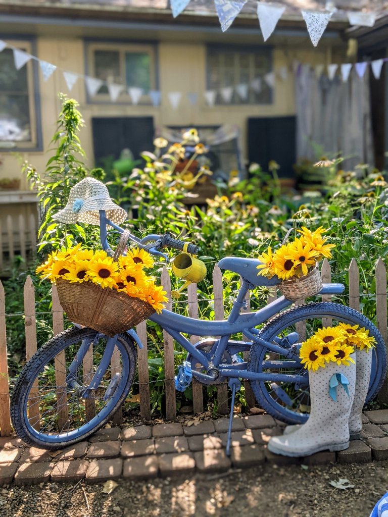 My daughter’s childhood trike is all decked out for summer. Rag ribbons and a little basket of sunflowers adorn the handlebars. How fun seeing her treasured tricycle upcycling around the backyard gardens!