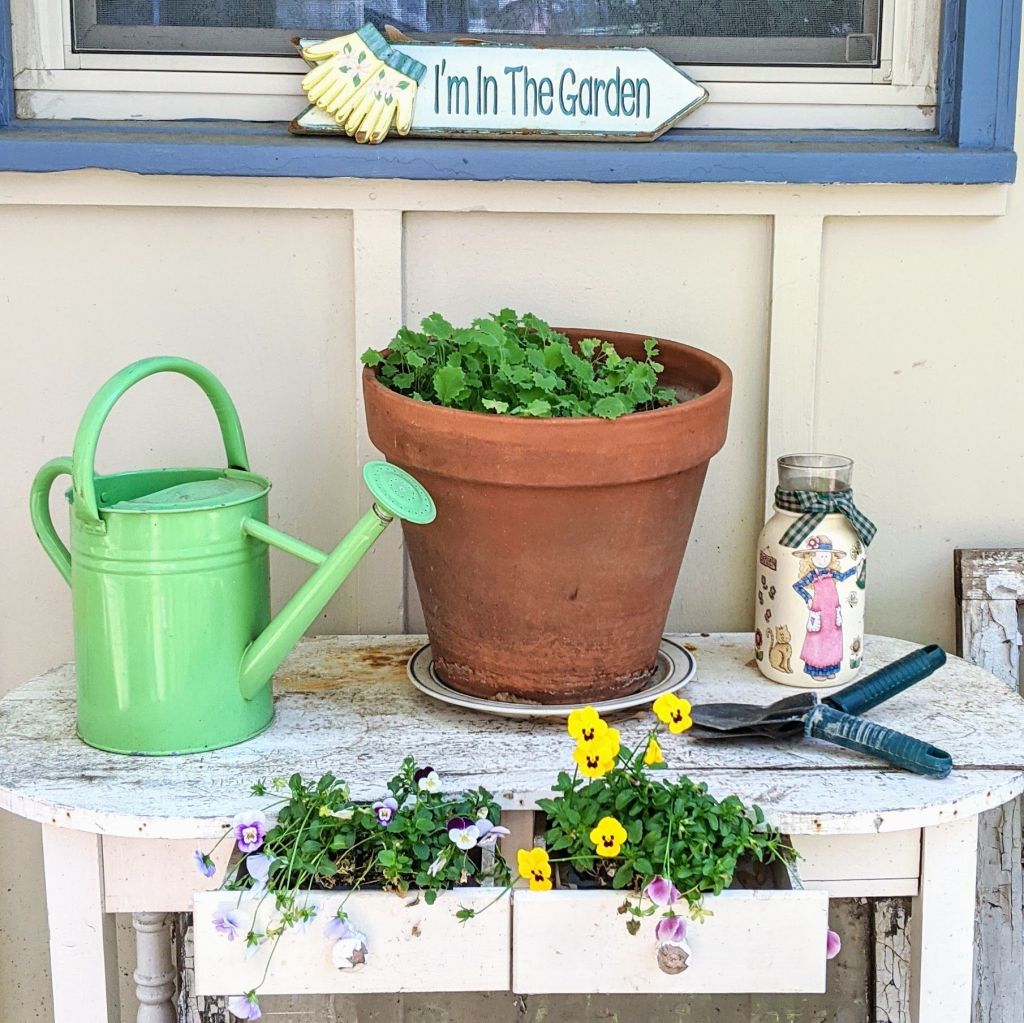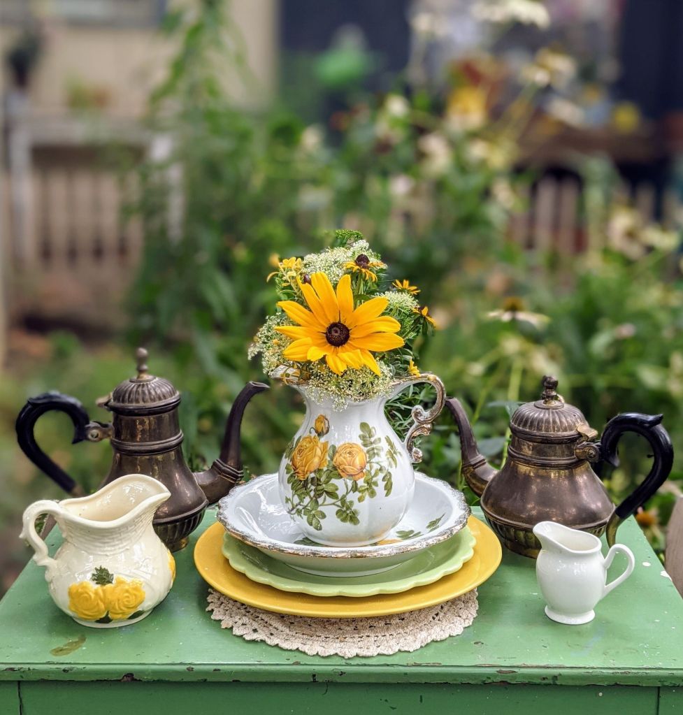 People often ask where I find my garden treasures. Most of my “containers” are found at thrift stores and estate sales. Some are curbside finds, which I fondly call Curb to Cottage. I’m especially drawn to vintage finds, giving new life to old things. However, anything goes when it comes to playing in the garden. An open mind filled with imagination is extremely helpful. I always envision how flowers will look in my flea market finds, before ever purchasing them. I especially enjoy sharing with the sales clerks how I intend to upcycle newfound treasures for my garden oasis. Not only does it spread seeds of creative gardening, but seeds of joy as well!