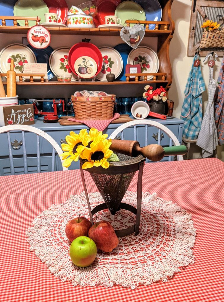 Homemade applesauce is a delicacy these days. So much so, that when I found at an estate sale a vintage fruit seive, used to make applesauce, I had no idea what it was. I was simply smitten with its green handle and how it would look filled with flowers. It didn’t disappoint. Flowers look cute as can be in a fruit seive.