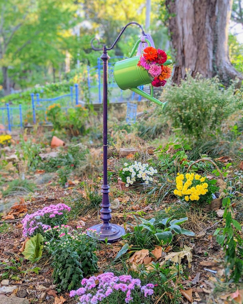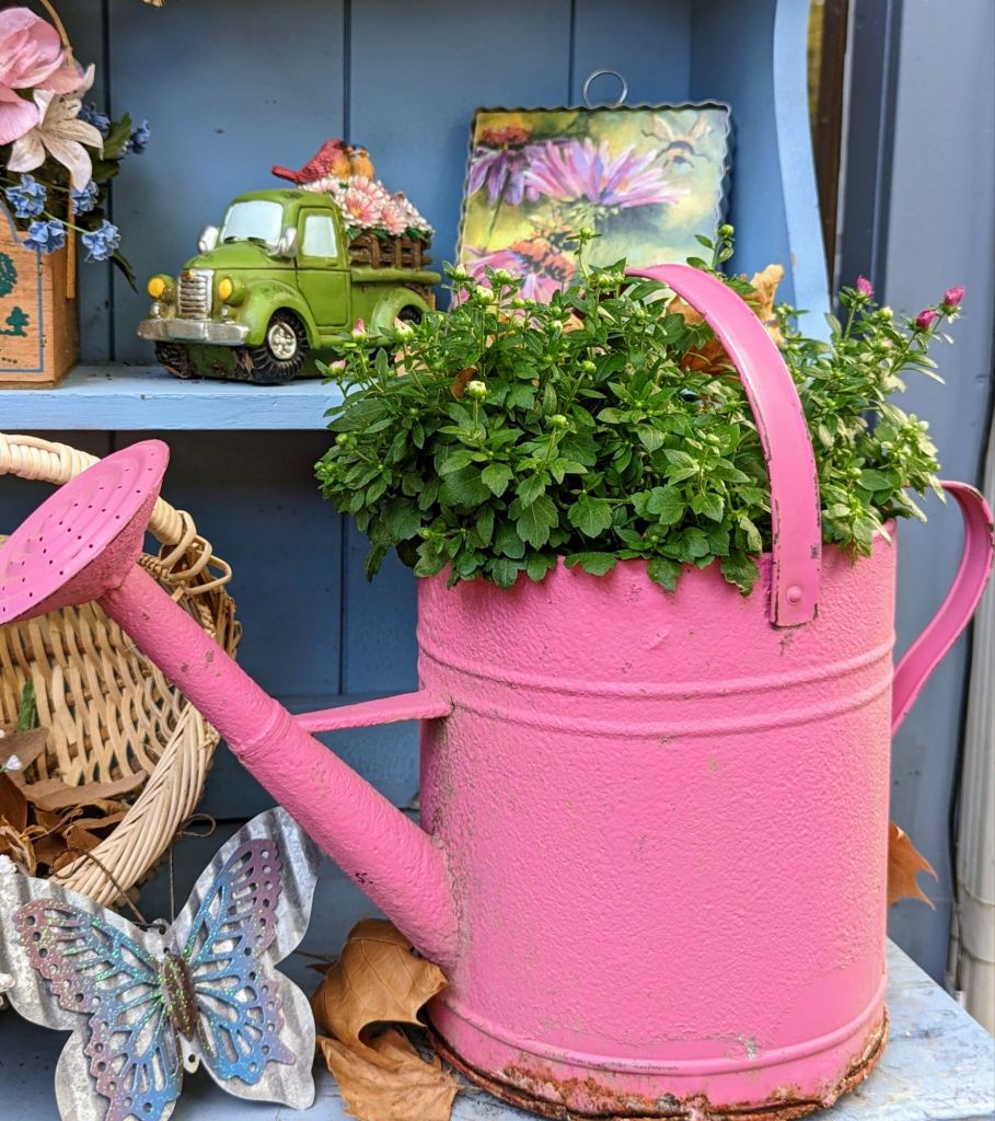 Bobbi runs a local estate sale business. We frequent her sales. She’s been good to us over the years. She once sold a bundle of old watering cans to me for just $5. Wow! This pretty in pink watering can looks even prettier when the mums bloom.