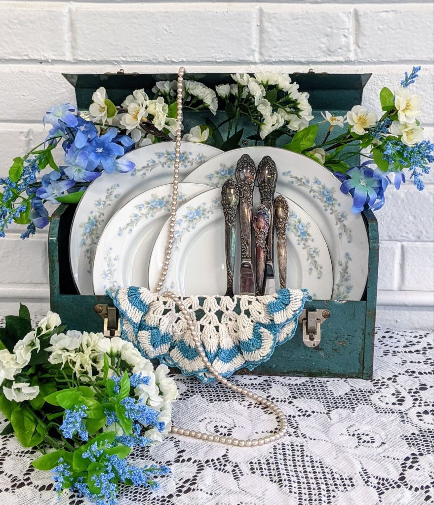 My favorite vintage toolbox is all decked out for Summer with faux flowers and delicate floral plates. Doesn’t this make the prettiest vignette displayed atop a dining buffet? Have you ever considered using a gussied up toolbox for guests to retrieve their dishes when hosting a buffet style dinner party? Adorn it with flowers, line it with lace, and fill it with plates and napkins.