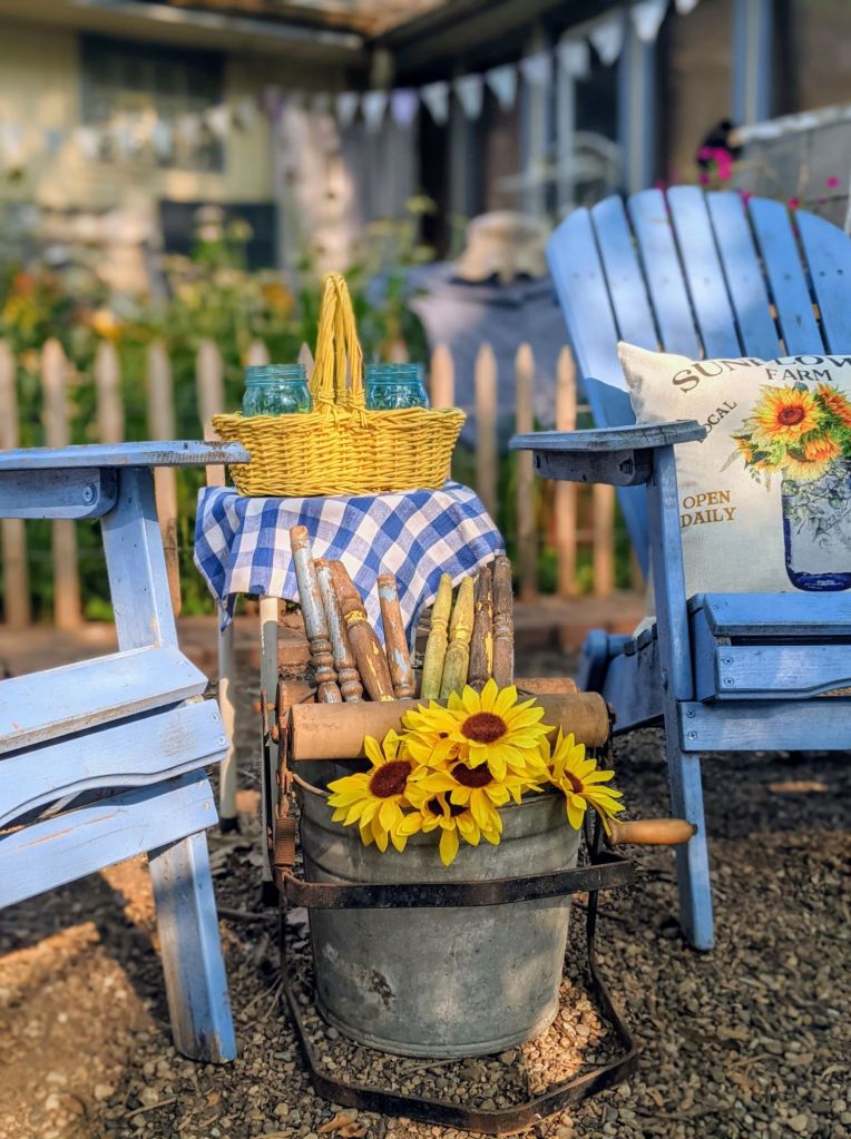 Sunflowers and spindles are my kinda bouquet! This blooming mop bucket adds late summer charm to a little garden seating area.