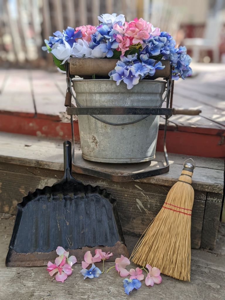 Sweeping up for Spring with vintage flea market finds. This back step vignette is just as pretty as it is unexpected. Who would have thought that an old repurposed mop bucket could be sooo beautiful!