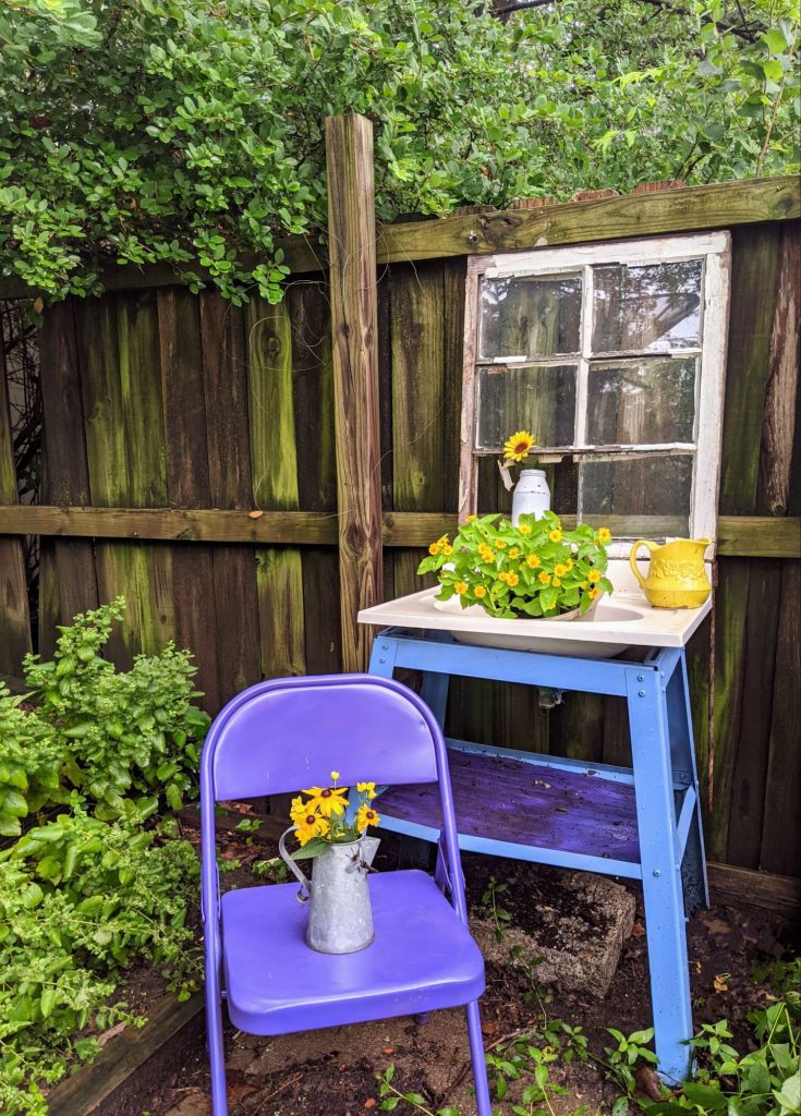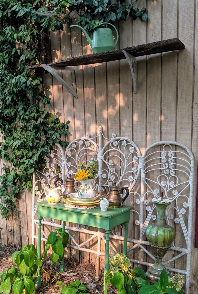Garden vignettes are guaranteed to draw onlookers… and smiles! Everything you see is a thrifted/ flea market find.