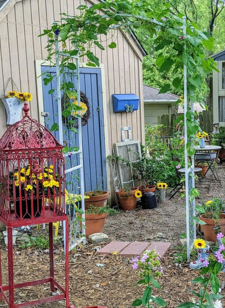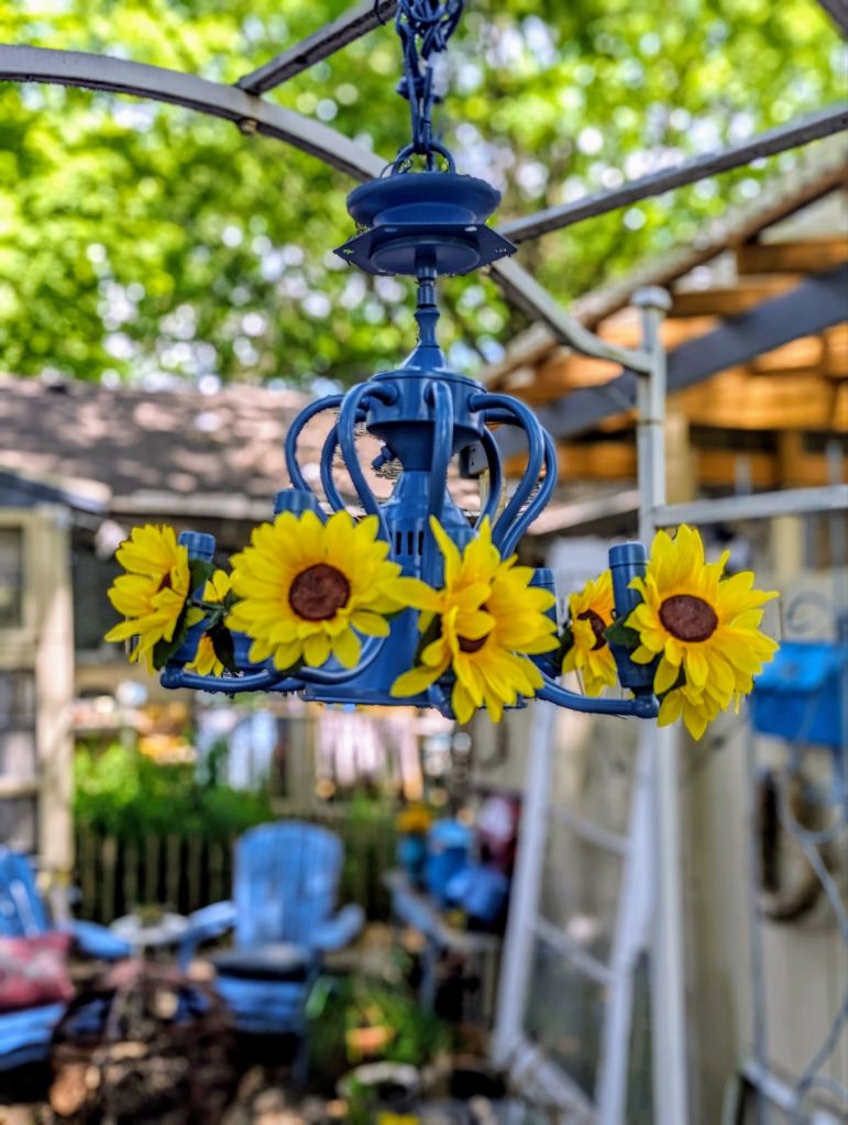 This blue-tiful sunflower garden chandelier is from a vintage stained glass hanging chandelier. My husband uses the shades to pair with old lamp bases to create cool upcycled lamps. Rather than trash this part, it gets new life hanging from my garden arbor.