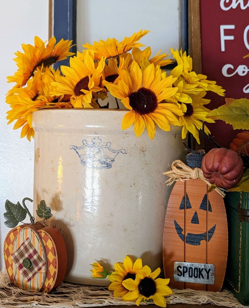 Dollar stores sell sunflower bouquets for just $1. Using them to fill a crock is such an easy inexpensive way to decorate for Fall. Plus, it looks fantastic!