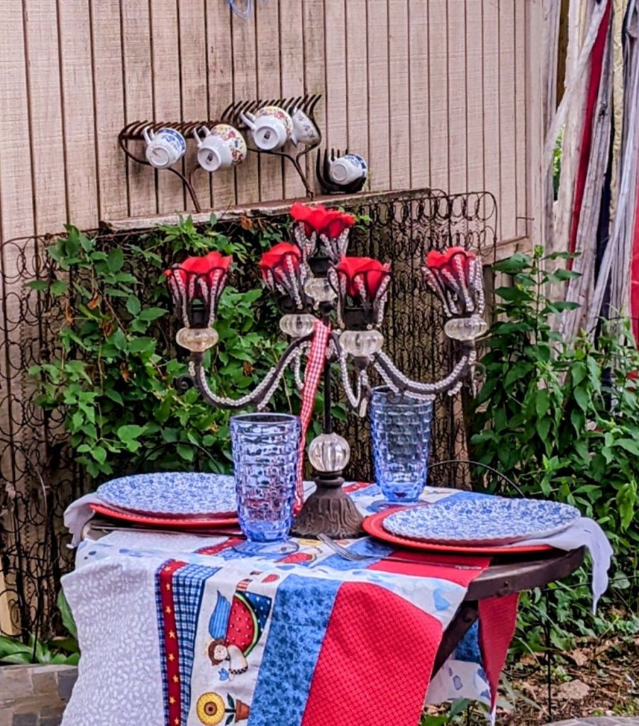 This rusty candelabra is a hand-me-down from a dear friend. Because the summer heat melts the candles, faux blooms are preferred. Roses add a romantic and eye catching pop of red color.