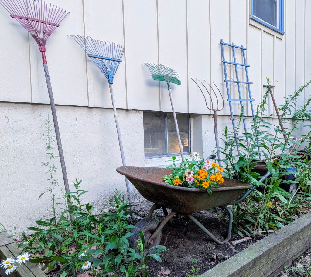 This is a different summer, where I display the repurposed wheelbarrow along with other vintage gardening tools. The cool thing about wheelbarrows is that they can be rolled around the garden. I call this garden my Pickin’ Patch because it’s filled with treasures picked for cheap AND flowers picked for bouquets.