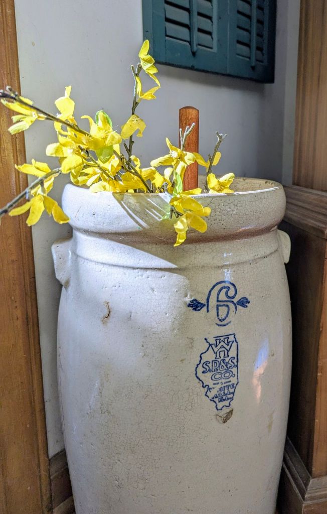 Forsythia blooms are long stemmed and pair well with a vintage butter churn crock.