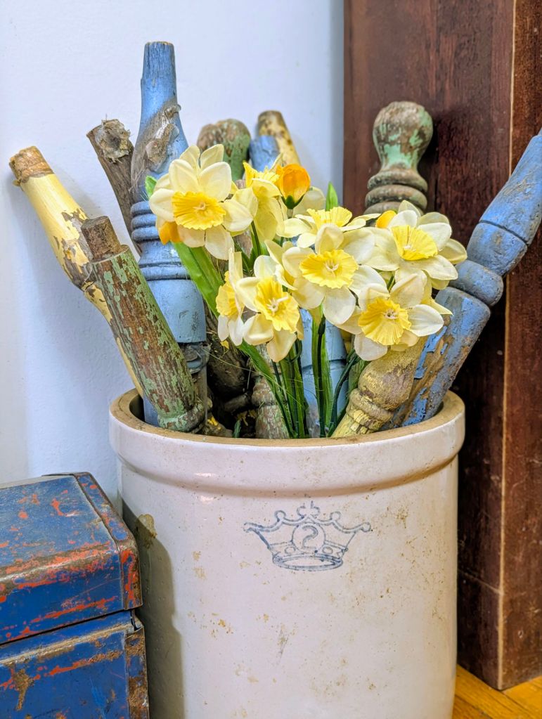 An old crock deserves some love with a bouquet of daffodils and chippy chair spindles. I enjoy adding interesting items to a faux bouquet, like these colorful spindles.