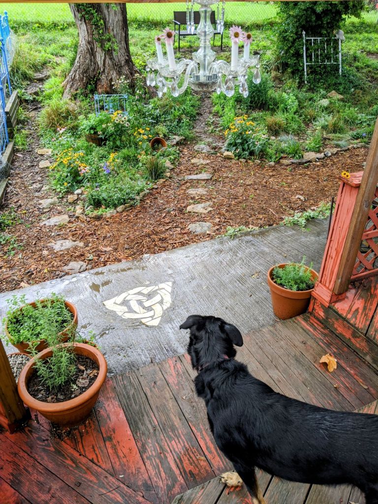 Even the dog admires this crystal chandelier adorned with purple coneflowers. Small floral water tubes help to preserve the fresh blooms. This beautiful chandelier was a $10 find at ReStore years ago. What a bargain!